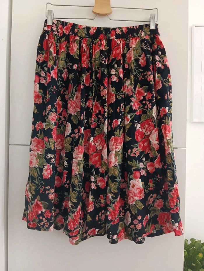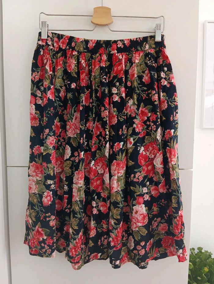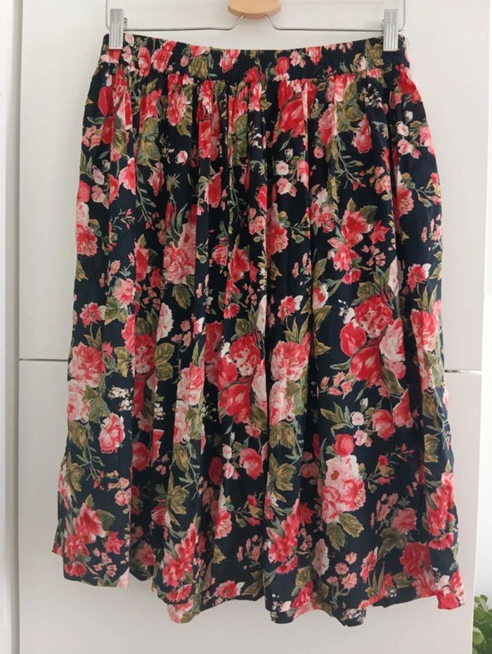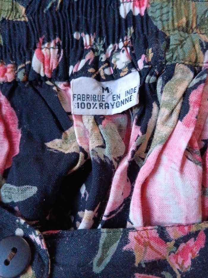 Jupe vintage entièrement boutonnée, Fond noir fleurs roses. Dos élastique, Convient pour la taille 40 Mesures Taille extensible de 37 à 47cm Longueur
