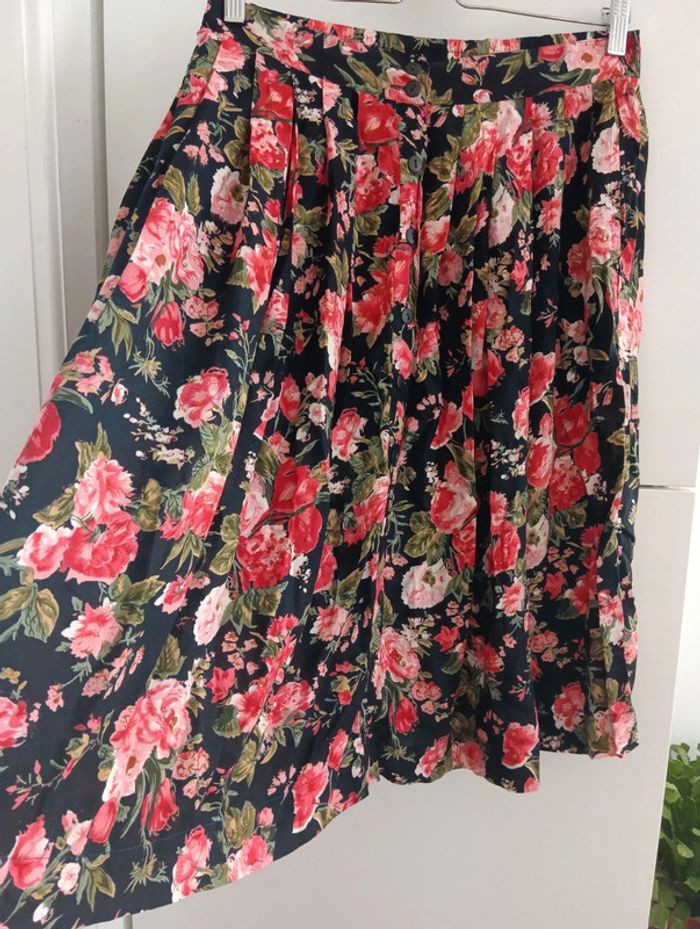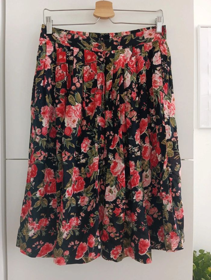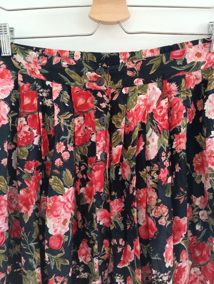 Jupe vintage entièrement boutonnée, Fond noir fleurs roses taille 40