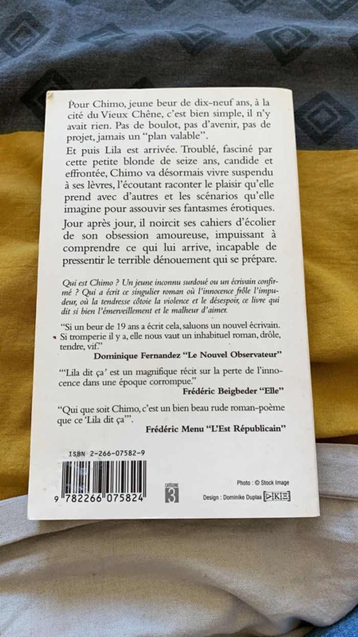 À Vendre Livre Lila dit ça de Chimo aux Éditions Pocket Neuf Jamais Lu Pour Chimo, jeune beur de dix-neuf ans, à la cité du Vieux Chêne, c’est bien simple, il n’y avait rien. Pas de boulot, pas d’avenir, pas de projet, jamais un « plan valable ». Et puis Lila est arrivée. Troublé, fasciné par cette petite blonde de seize ans, candide et effrontée, Chimo va désormais vivre suspendu à ses lèvres, l’écoutant raconter le plaisir qu’elle prend avec d’autres et les scénarios qu’elle imagine pour assouvir ses fantasmes érotiques. Jour après jour, il noircit ses cahiers d’écolier de son obsession amoureuse, impuissant à comprendre ce qui lui arrive, incapable de pressentir le terrible dénouement qui se prépare.