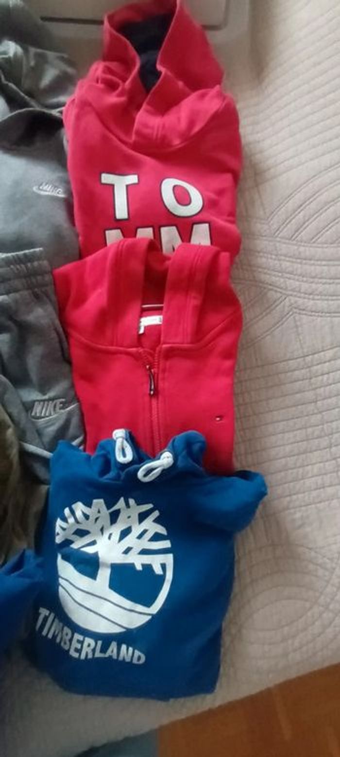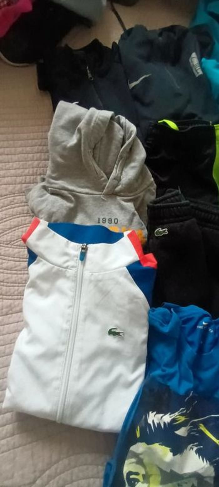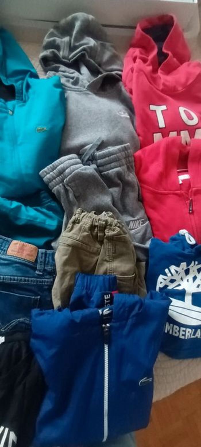 Lot contenant 1 veste tommy, 1 sweat tommy, 1 sweat timberland, 1 veste lacoste, 1 sweat Jack and jones, 1 veste nike, 2 joggings nike, 1 jogging lacoste, 1 bas de jogging lacoste, 1 cargo kaki name it, 1 jean levis, 1 tee shirt nike et 1 tee shirt calvin klein, attention il y a qune veste lacoste l'autre qui est sur la photo est déjà vendu ainsi que le jogging Nike gris et le jogging Lacoste couleur menthe