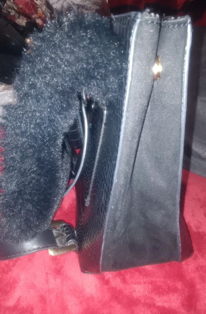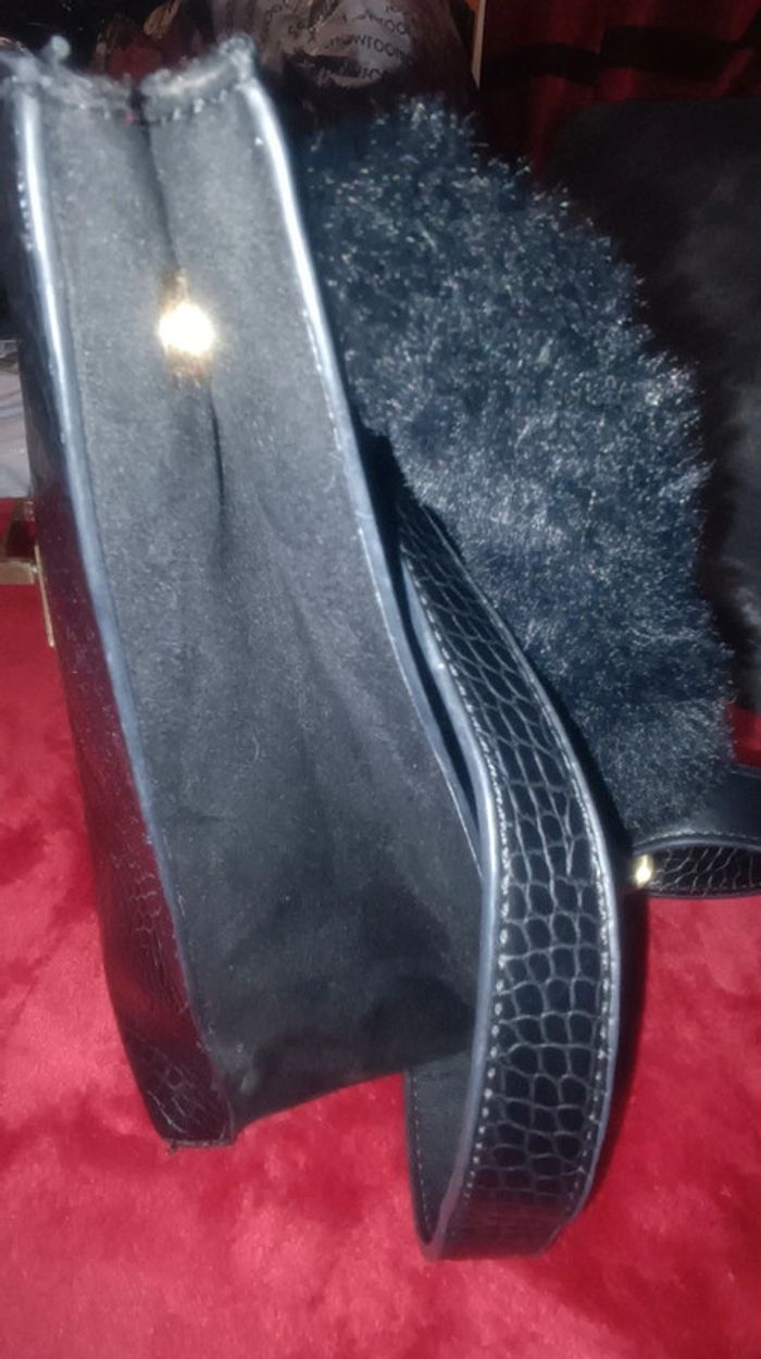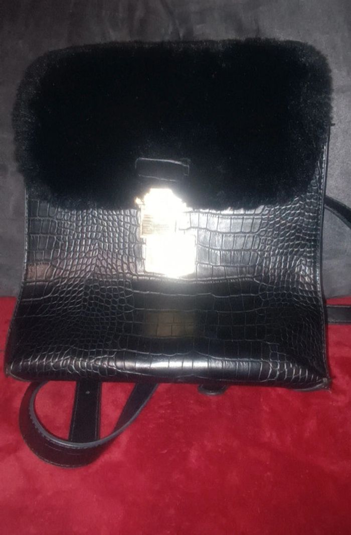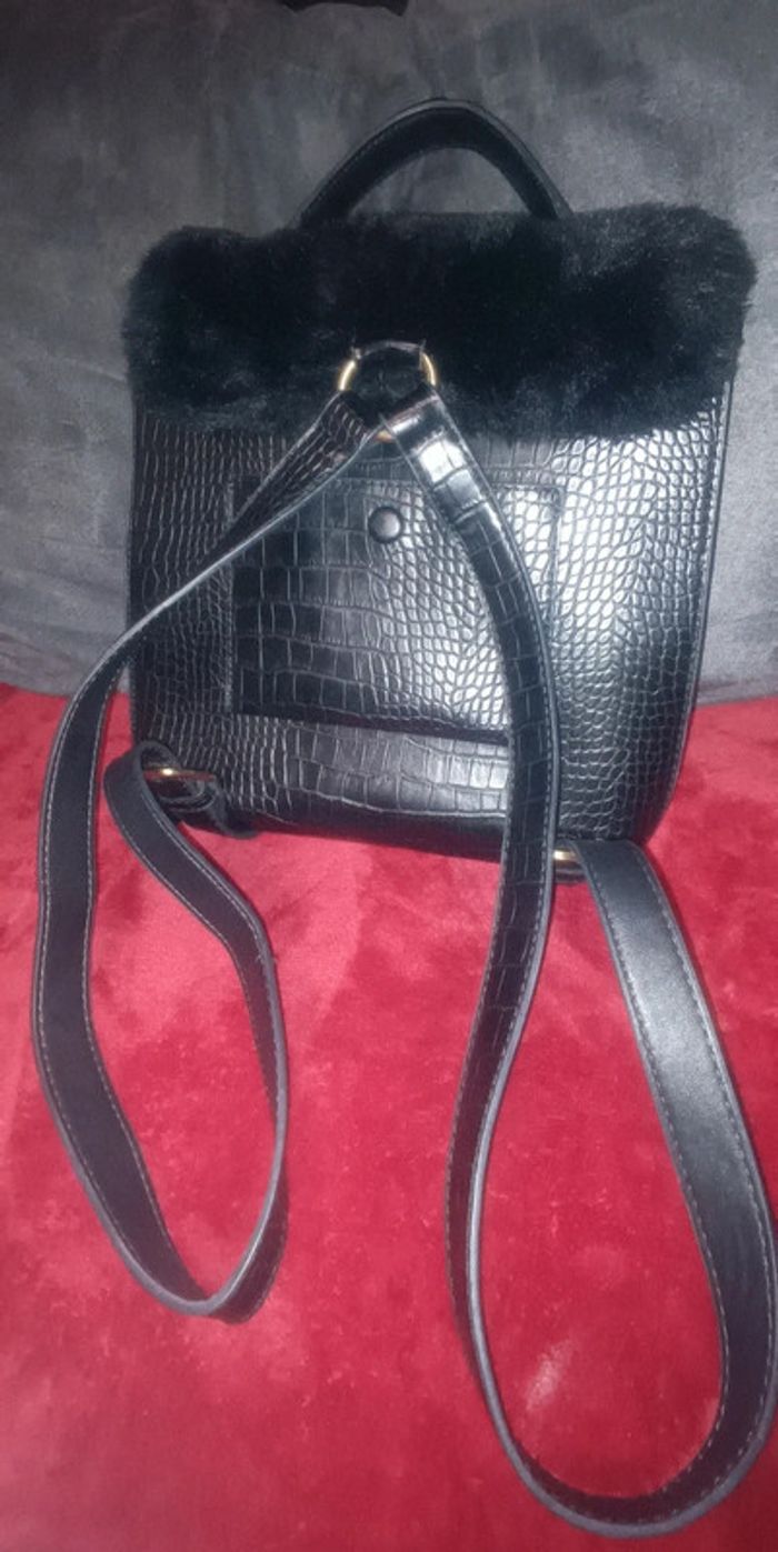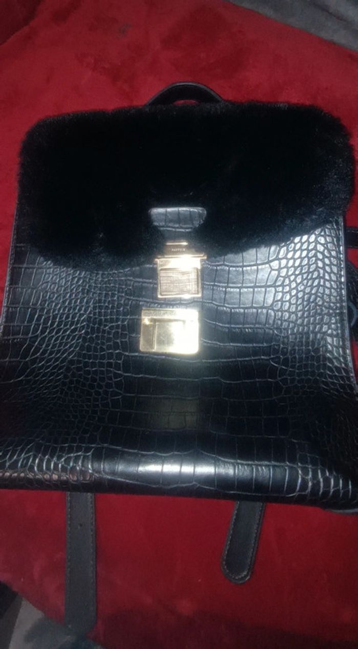 Sac à dos noir effet croco et fourrure avant, en très bon état.