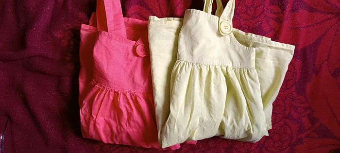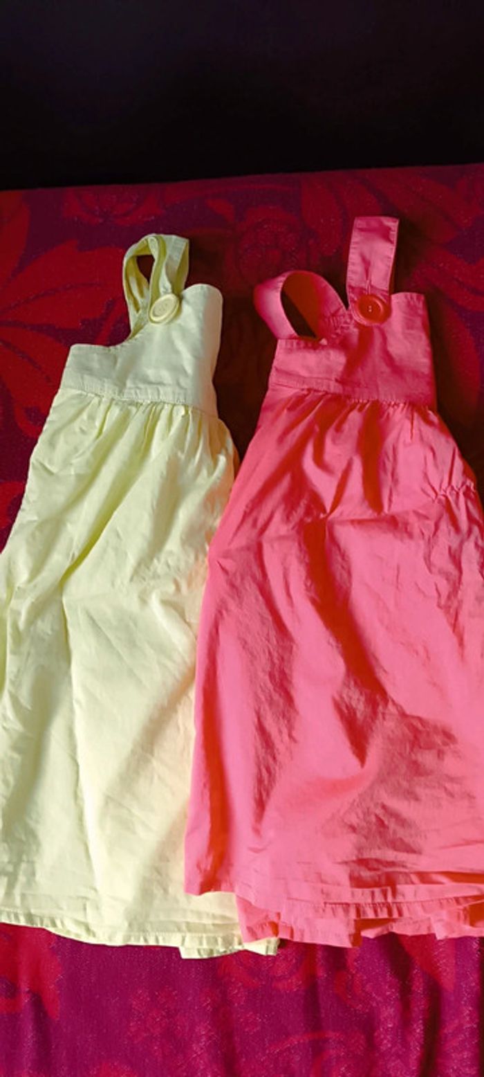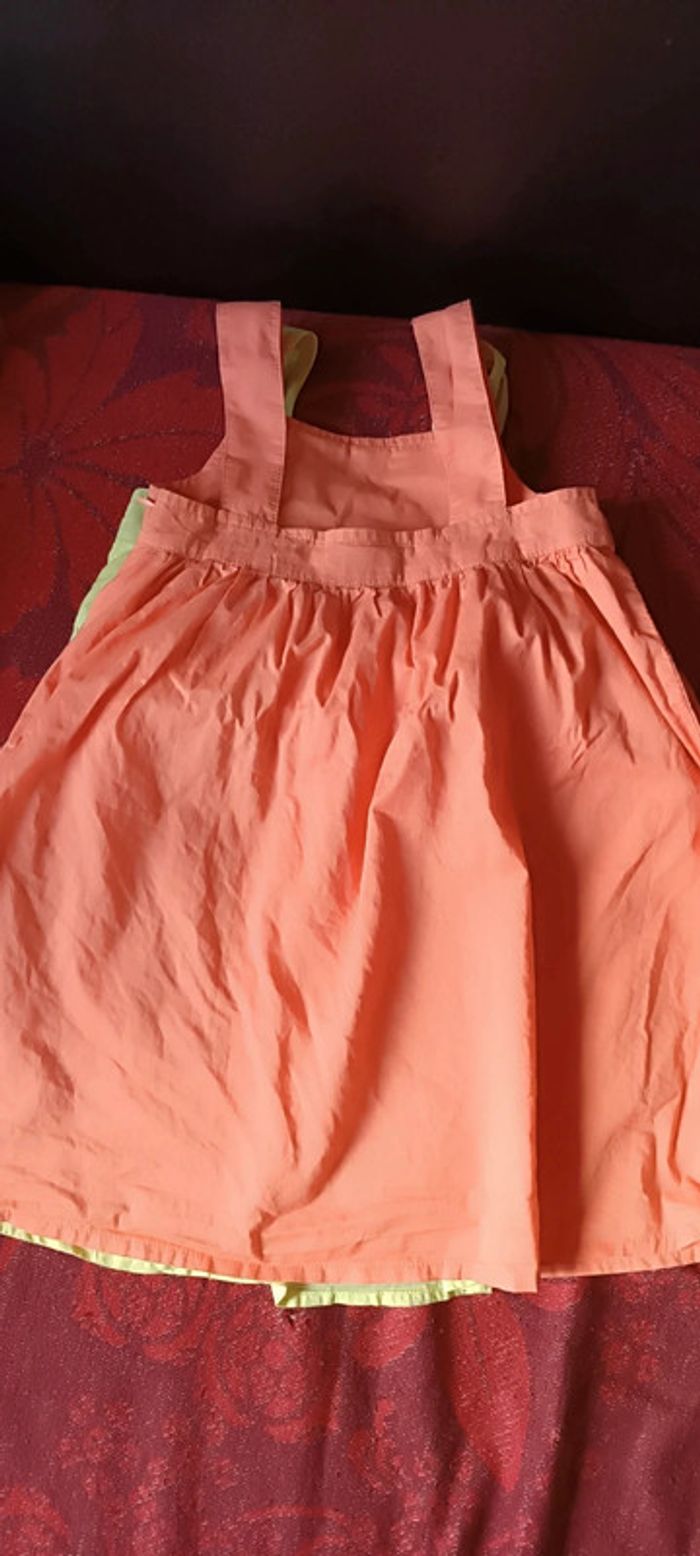 2 robettes avec doublure en très bon état, couleur orange et vert clair, pour petite fille de 3/4 ans