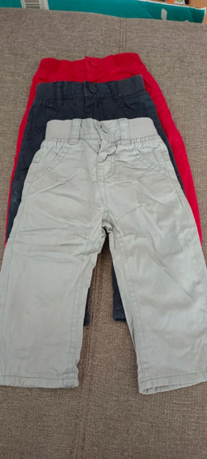 Je vends ce lot de 3 pantalons qui sont identiques seul la couleur change. Vous avez bleu marine, rouge et gris. Pantalons non abîmés , pas de trous , pas d'usure Pantalons où bébé sera à l'aise. Tape à l'oeil 3 mois