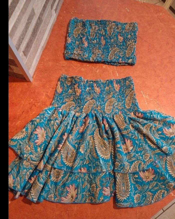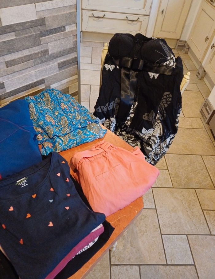 Lot comprenant 1 magnifique robe bustier 1 ensemble bandeau / jupe 1 short 1 veste imperméable 2 T.shirts manches courtes 1 débardeur 1 blouse 4 T.shirts manches longues 1 sweat léger 4 brassières 5 jeans 2 leggings Différentes marques : kiabi, gemo, disney, quechua, jennyfer....