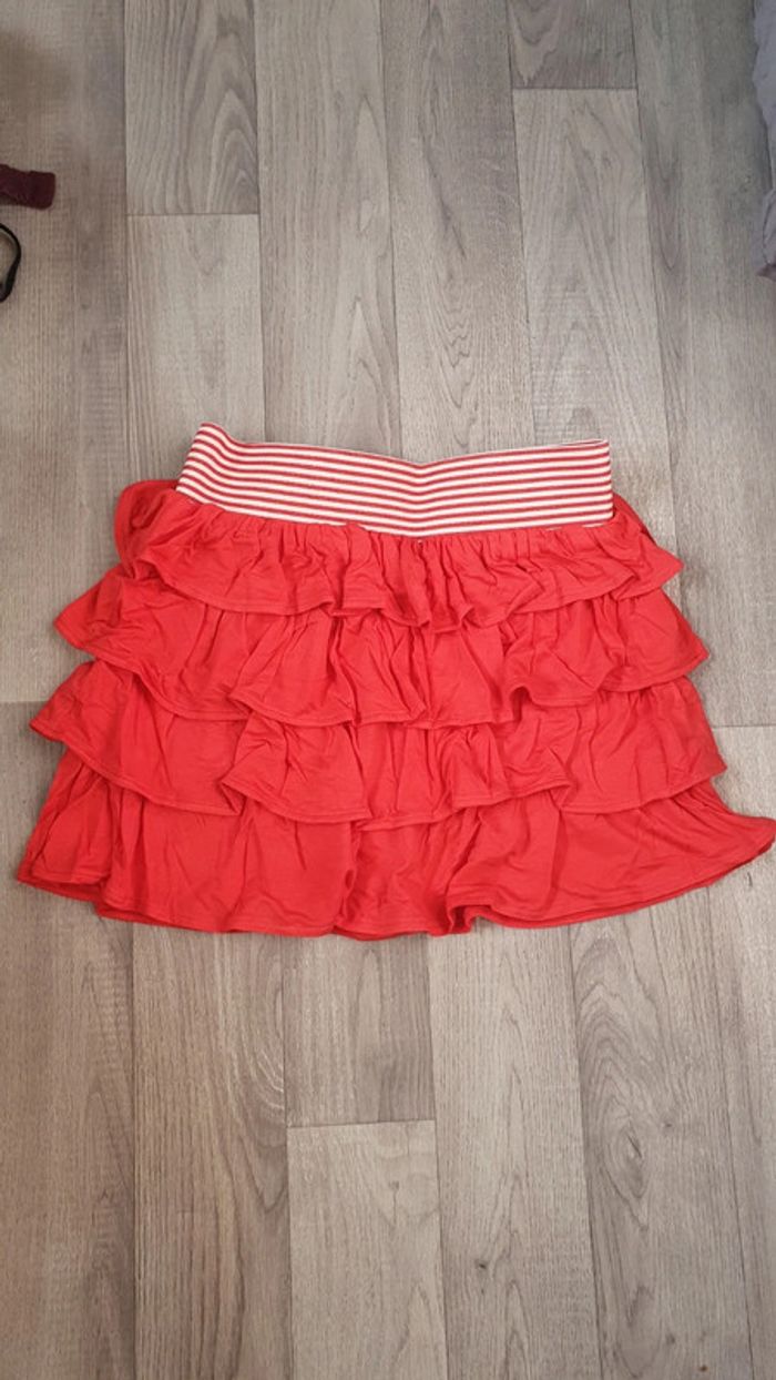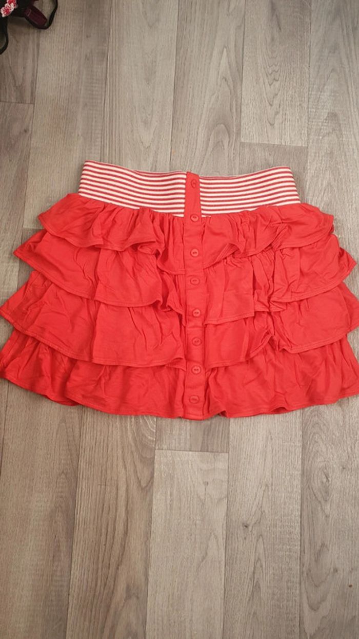 Neuve jamais portée Jupe corail froufrou/volants type charleston Ceinture ajustée rayée blanche et corail 96% viscose 4% élasthane Doublure 100% polyester #rams36 #ramsjupe36 #y2k #vintage