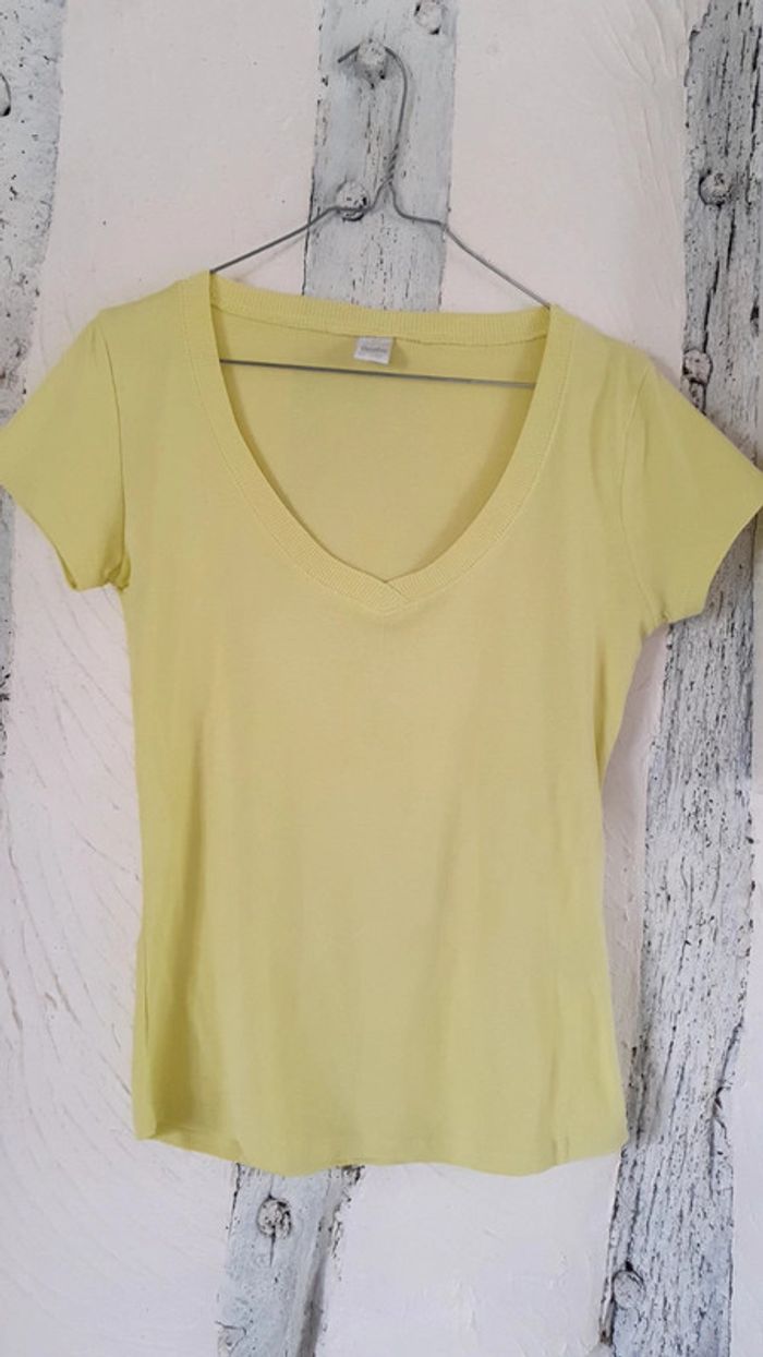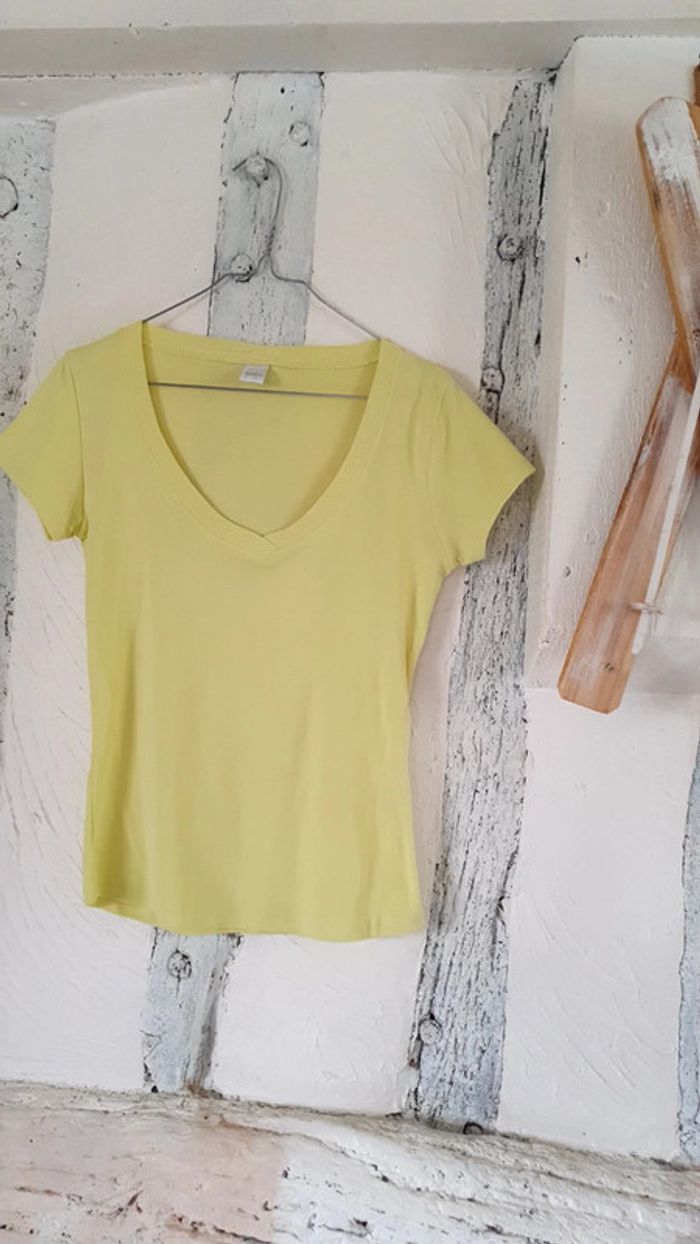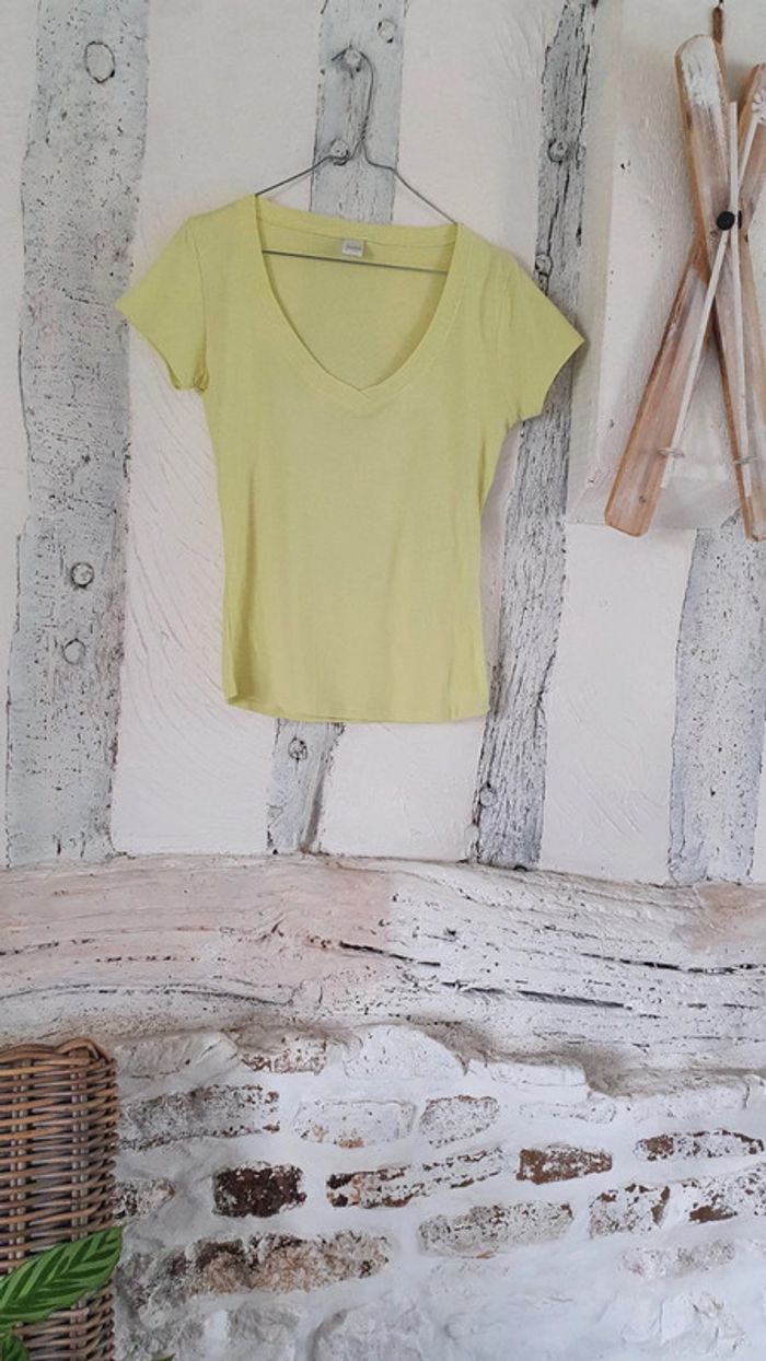 Très bon état Tee shirt uni vert anis Col légèrement en V 100% coton Taille 2, correspond à du 38/40 #rams38 #rams40 #ramshaut38 #ramshaut40
