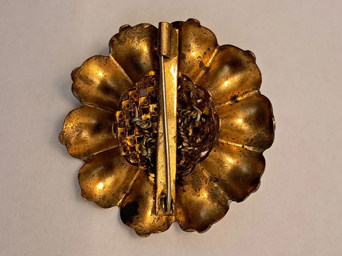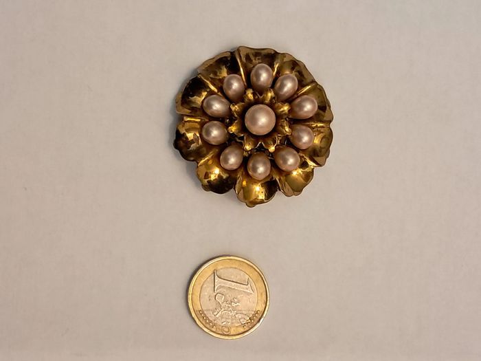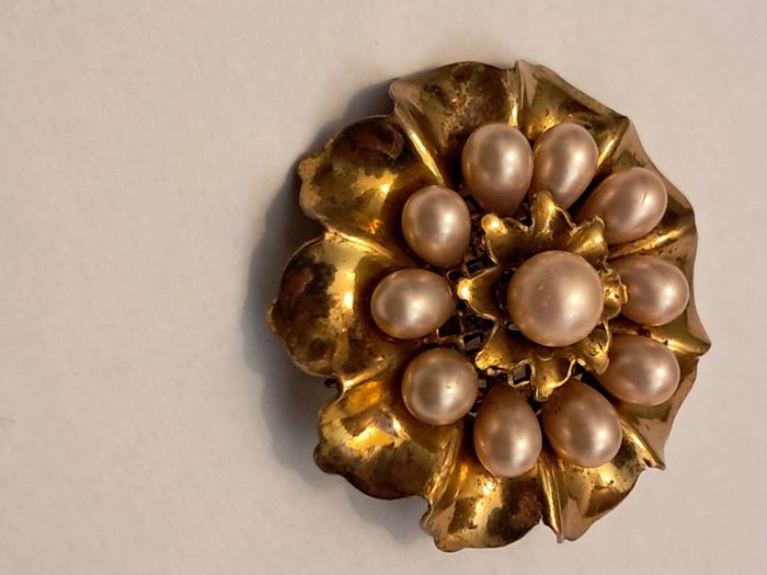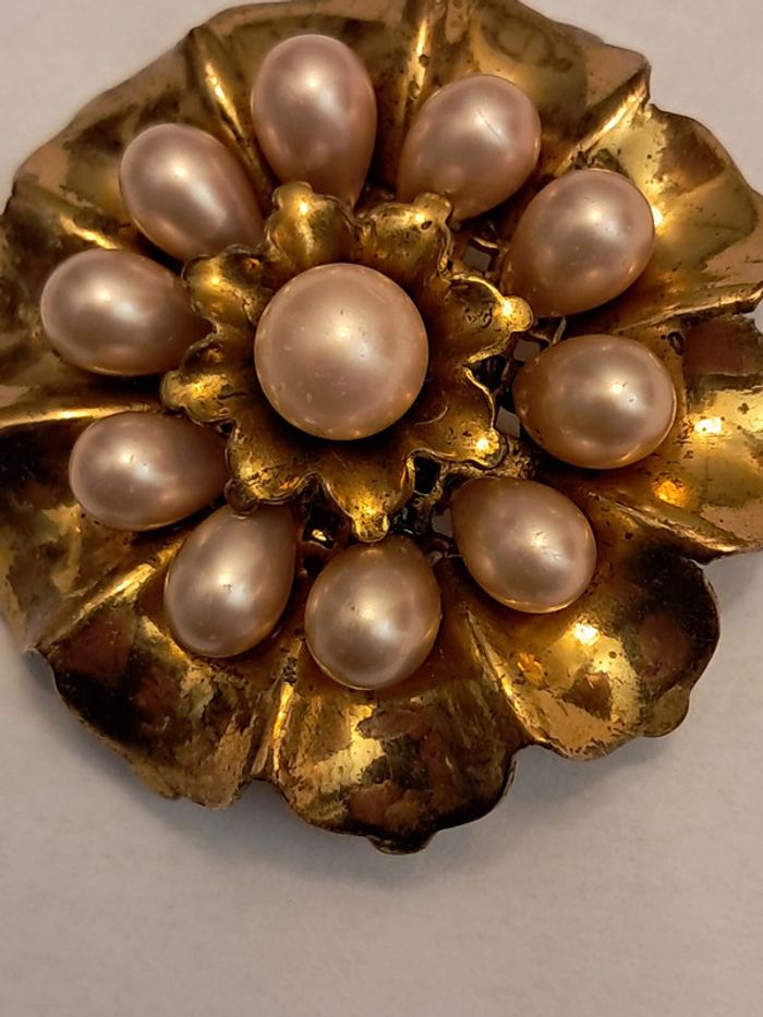 Ancienne. Vers 1950. Laiton doré et perles fantaisie. Les perles sont en parfait état. Tres bon etat Quelques points d oxydation sur le métal, visibles a la loupe.