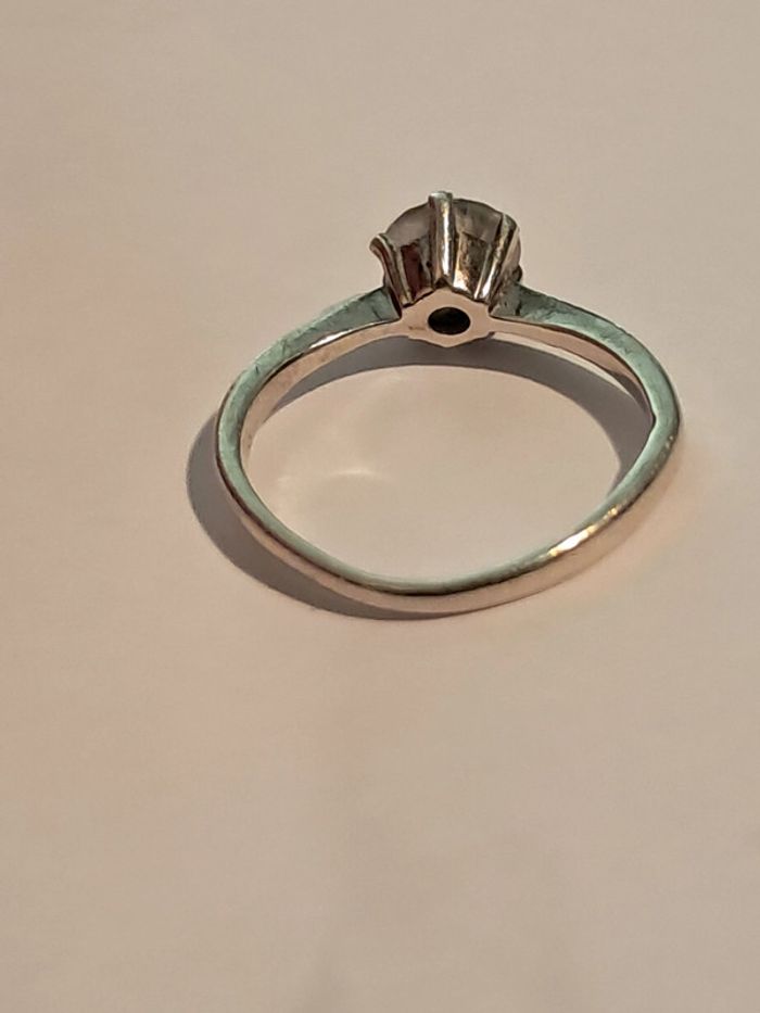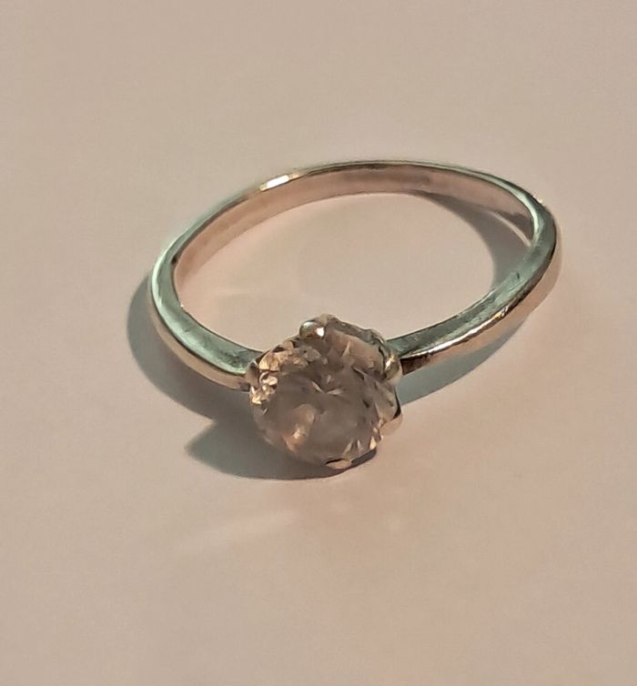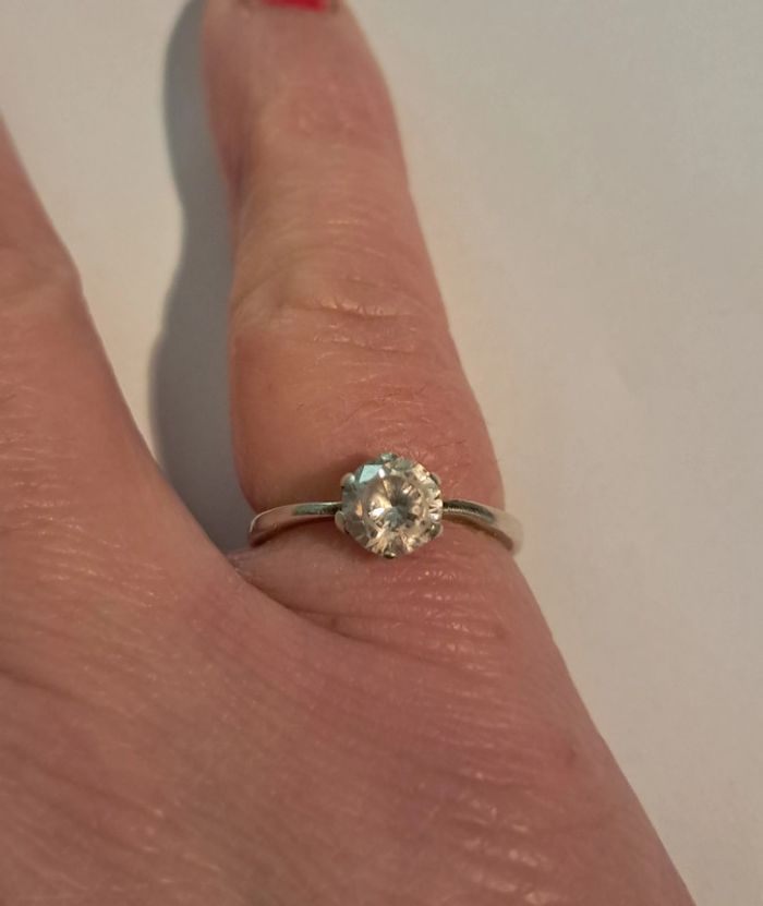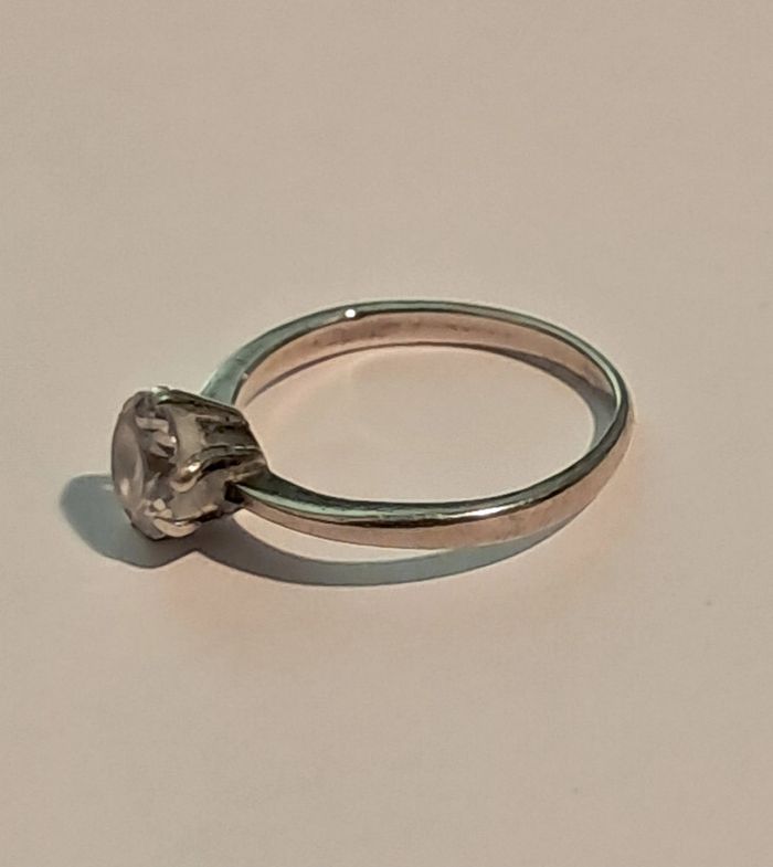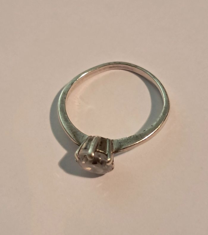 Belle bague en argent et pierre blanche . Taille 52/53. Poincon 925 tres effacé a l interieur de l anneau. Anneau legèrement déformé ce qui ne se voit pas lorsque la bague est portée.