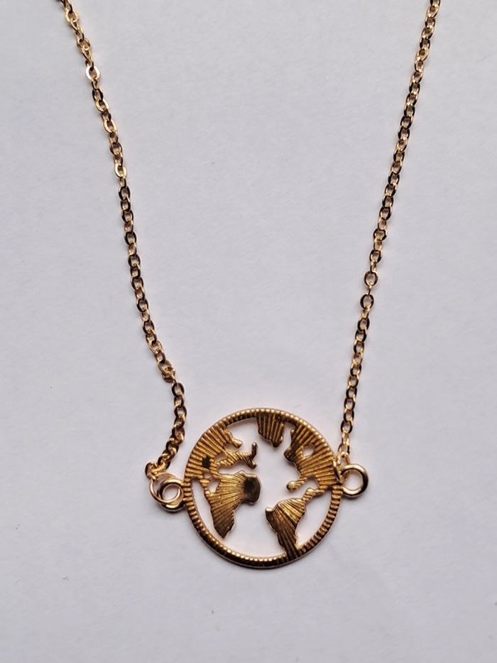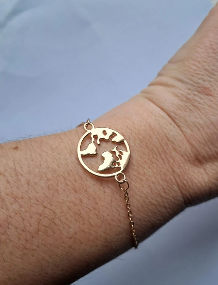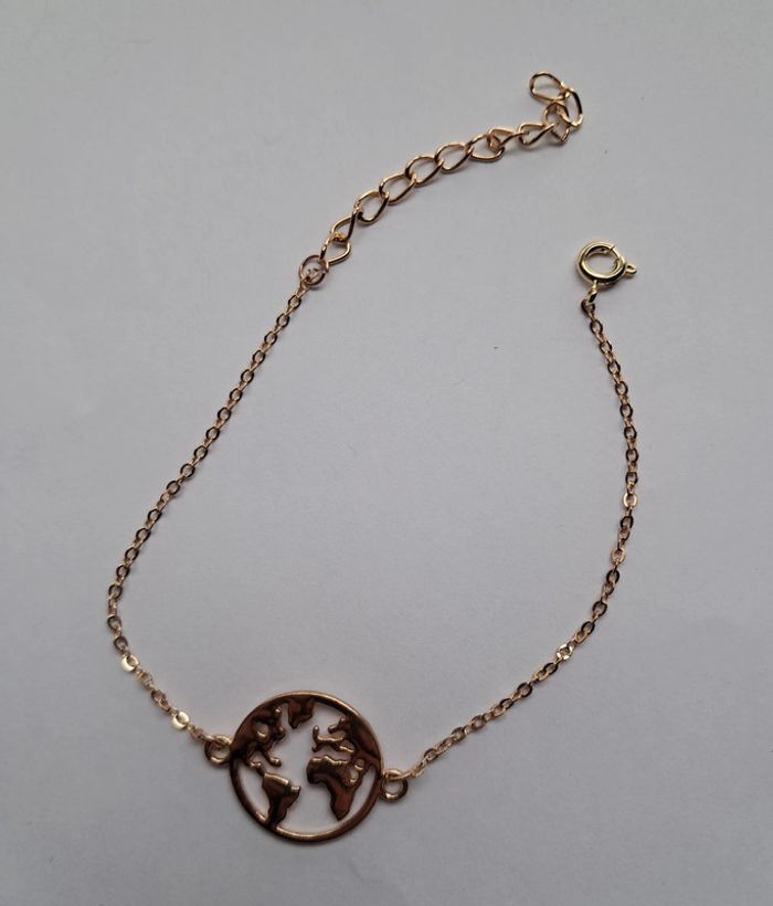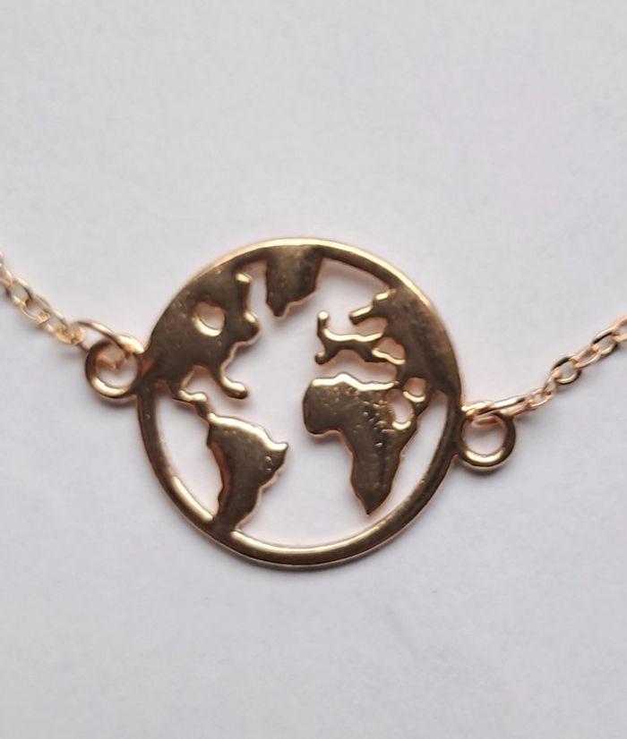 Bracelet chaine fine et charm planisfere. Carte du monde. Doré mais pas de poinçon. Longueur reglable de 18 a 23 cm.
