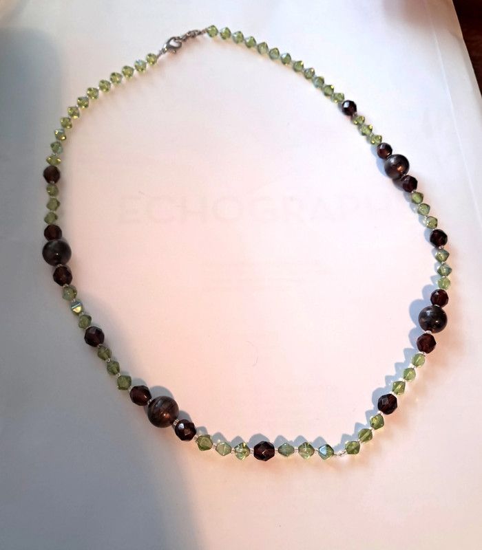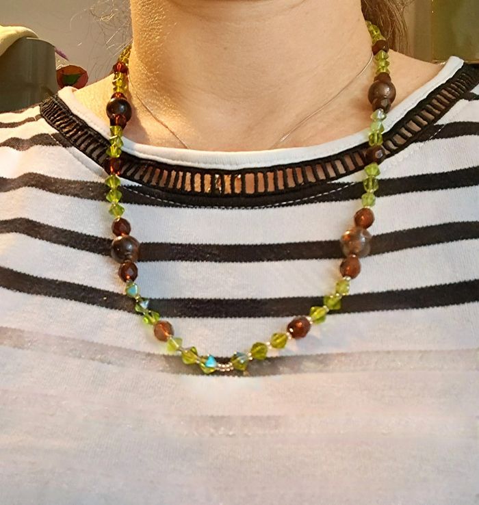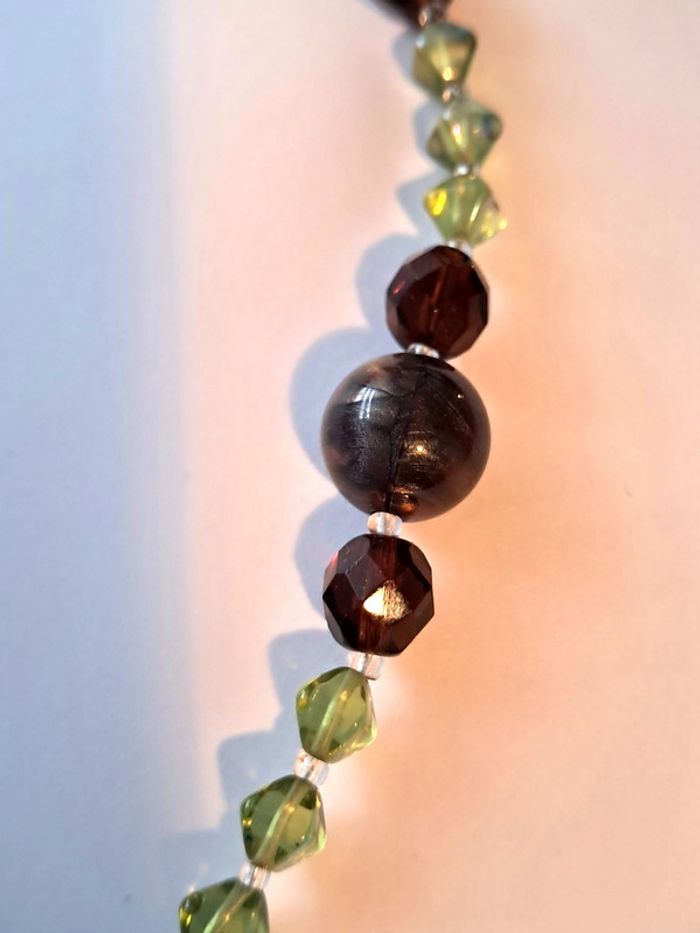 Perles de verre vertes, marrons et mordorées. Long 61 cm.