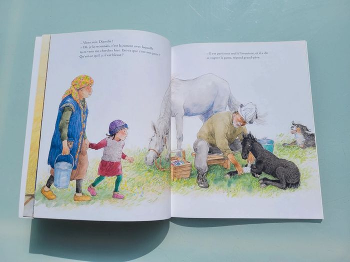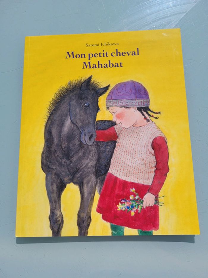 L'ÉCOLE DES LOISIRS COUVERTURE SOUPLE MON PETIT CHEVAL MAHABAT Pour la première fois, Djamilia vient passer ses vacances dans les montagnes du Kirghizistan, chez ses grands-parents éleveurs de chevaux, qui dorment dans une belle yourte blanche. mais où est Petit-Noir le poulain ? Parti tout seul à l'aventure, il s'est blessé à la patte. Il faut l'aider à téter sa maman, le rassurer, lui parler doucement, le panser... Djamilia est prête à apprendre tout cela, pour l'amour de Petit-Noir !  21.5x26.5 cm Très bon état Mes autres livres enfants : #livreenfantmooglou Mes autres école des loisirs : #lecoledesloisirsmooglou
