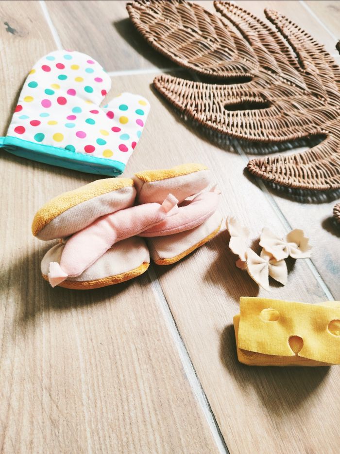 🎀Avec aliments en peluche/tissu : pain sandwich et gruyère à scratch , manique gant , pâtes, saucisses, ...