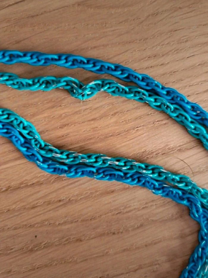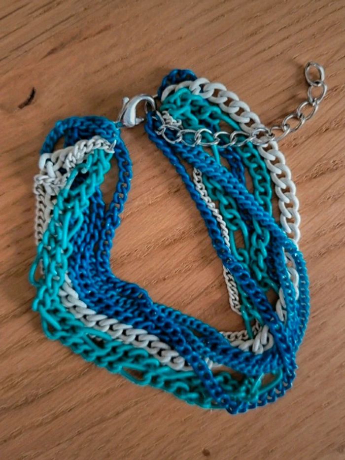 . Ensemble de 2 bijoux dans les tons bleu et turquoise : - 1 collier multirang avec 2 chaînes dont la couleur est partie à certains endroits (voir photo, peu gênant porté) Longueur totale : 65 cm + 5 cm de chaînette d'ajustement - un bracelet assorti composé de 8 chaînes différentes en très bon état Longueur totale : 17 cm + 5 cm de chaînette d'ajustement 🌸 Et si vous alliez faire un tour dans mon dressing ? Les réductions sur les lots sont activées 🩷