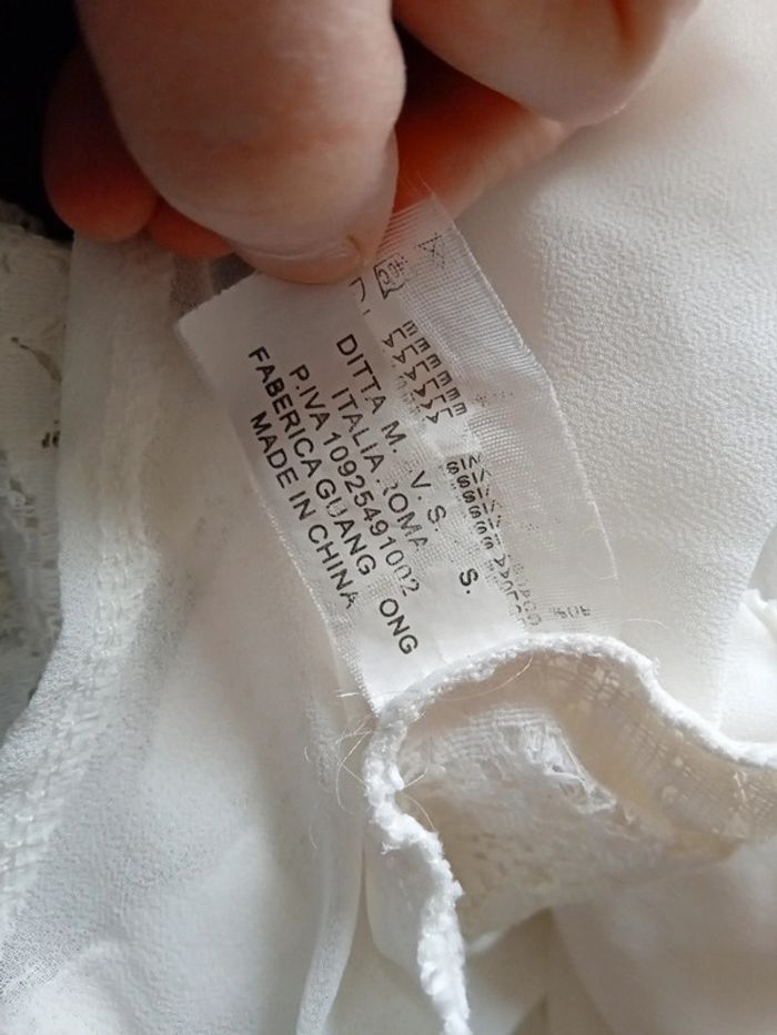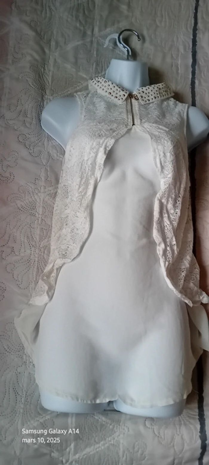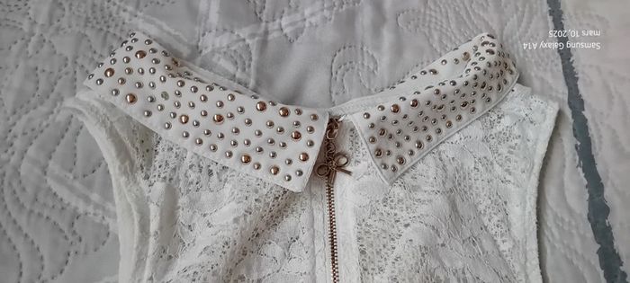 Haut sans manches en coton viscose et elastanne aspect voile semi transparent dentelle motif floral devant et au dos col avec fermeture éclair avec noeud et clous sur le col effet superposé plus long devant que derrière longueur 71 cm devant 55 cm derrière largeur aisselles à aisselles 42 cm ideal pour une grande occasion ou cérémonie marque italienne peu portée en très bon état #midole #midolefemme #midolefemme38 ##hautfemme38 #femme38 #tuniquefemme38 #hautceremonie38 #hautavecdentelle #débardeur #ditta hautavecclous #hautavecfermetureeclair #hautblanc #hautceremonie38