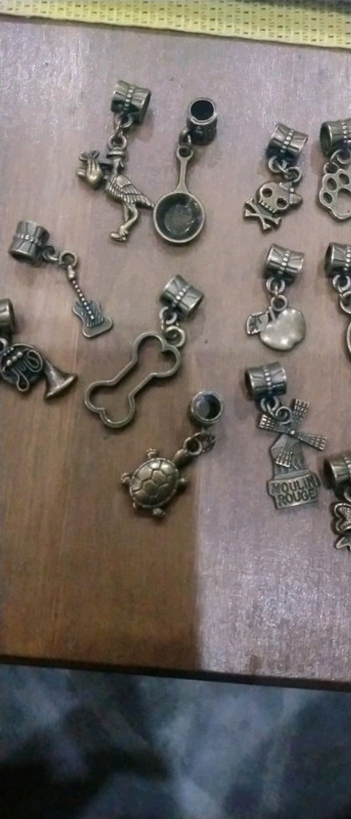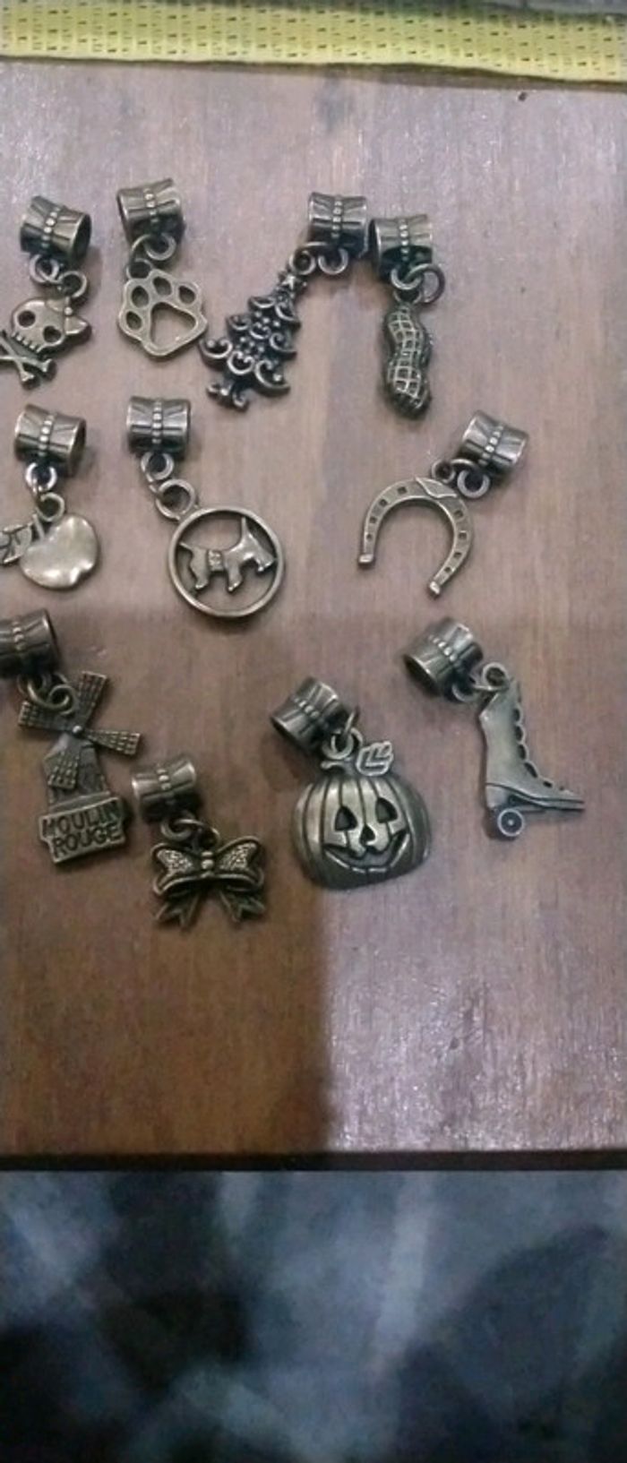 17 Charms fantaisie couleur bronze Très bon état Pour certains très peu porté et d'autres pas du tout Plusieurs thèmes et modèles dans mon dressing je me sépare de toute ma collection de charms fantaisie.