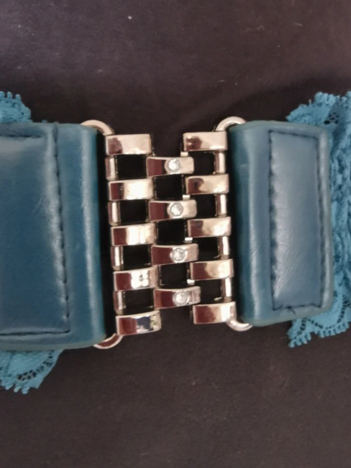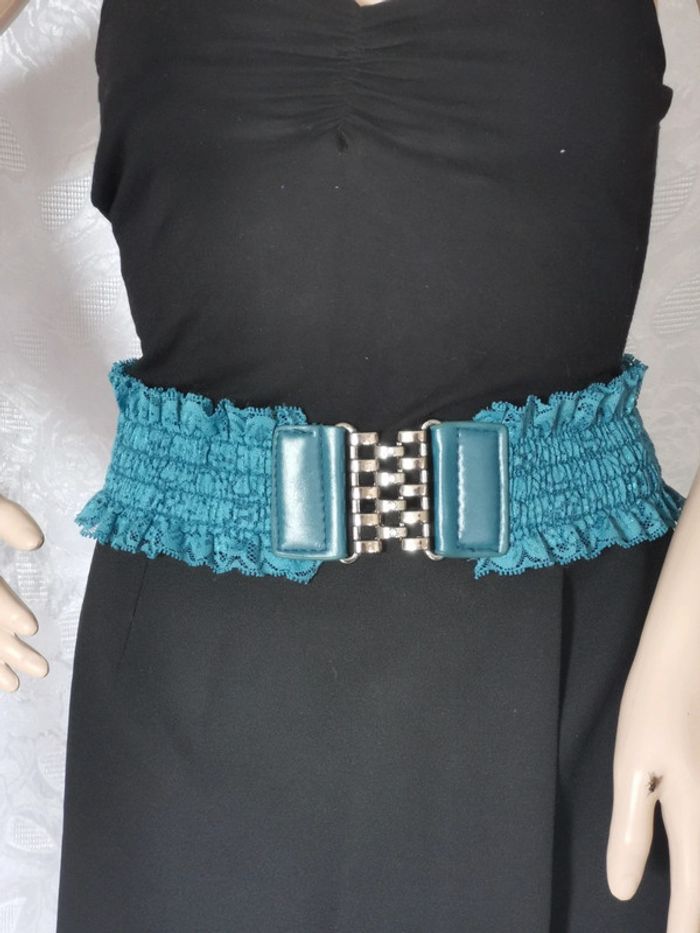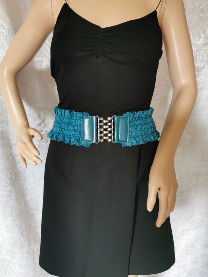 Bonjour 😊 Ceinture vintage. Bleu pétrole Élastique et effet dentelle. Attache de couleur vieil argent avec 4 crochets ornés de strass. Taille unique, conviendra à 36 à 42. Longueur à plat sans l'étirer 65 cm Largeur 7,5 cm 💕Réduction activée dès 2 articles 👗Les articles de mon dressing sont classés par # et par taille dans la section à propos de mon profil afin de faciliter vos recherches ➡️Frais de livraison plus avantageux avec Mondial relay.