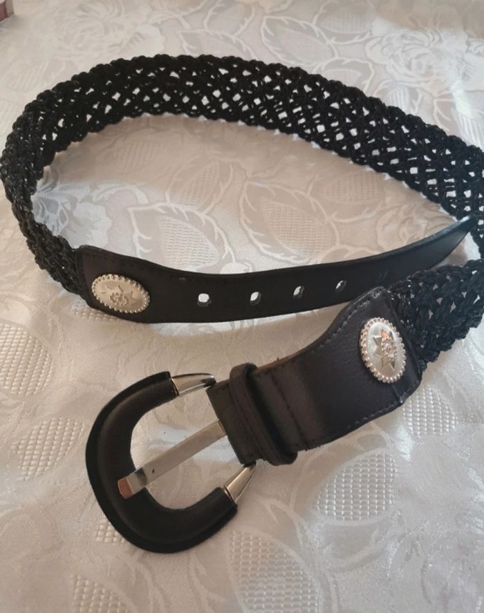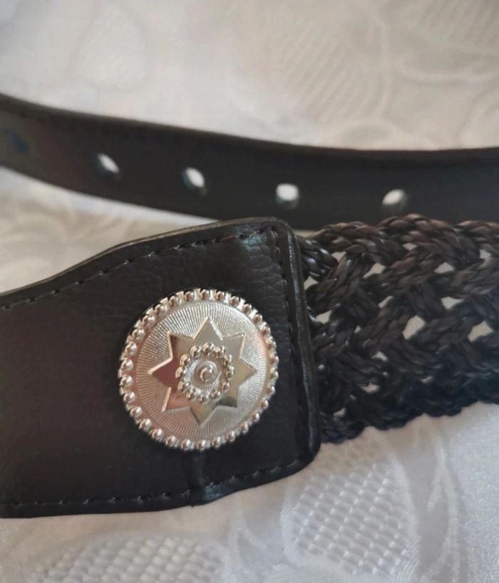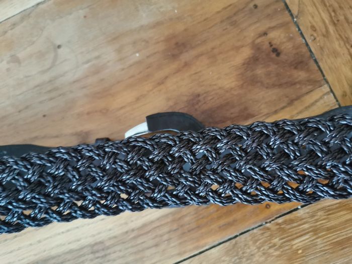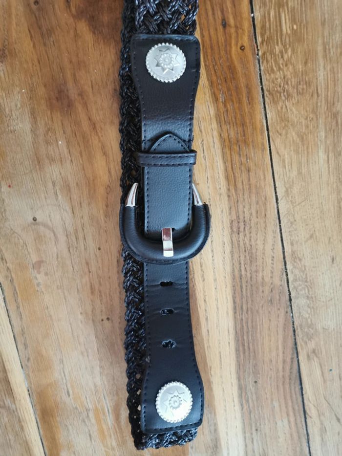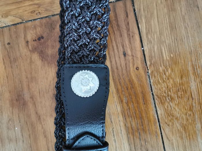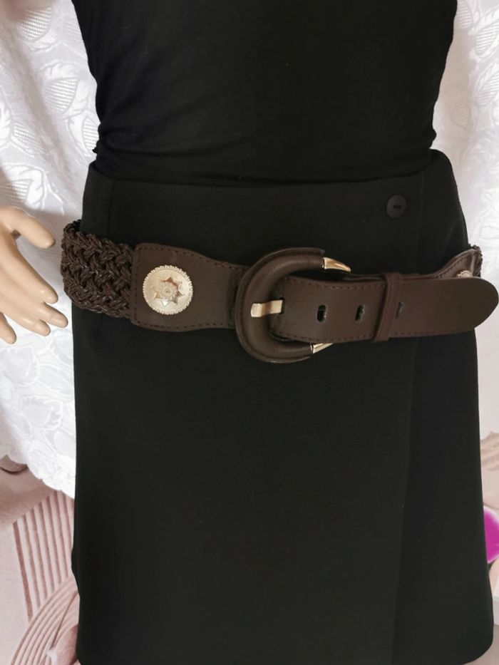 Bonjour 😊 Ceinture fantaisie synthétique. Marron et argentée. Tressée. 5 trous. Longueur boucle incluse 103 cm Neuve mais un petit manque de matière à l'intérieur (voir photo) du au frottement au stockage. 💕Réduction activée dès 2 articles 👗Les articles de mon dressing sont classés par # et par taille dans la section à propos de mon profil afin de faciliter vos recherches ➡️Frais de livraison plus avantageux avec Mondial relay