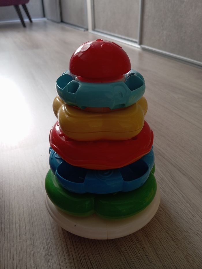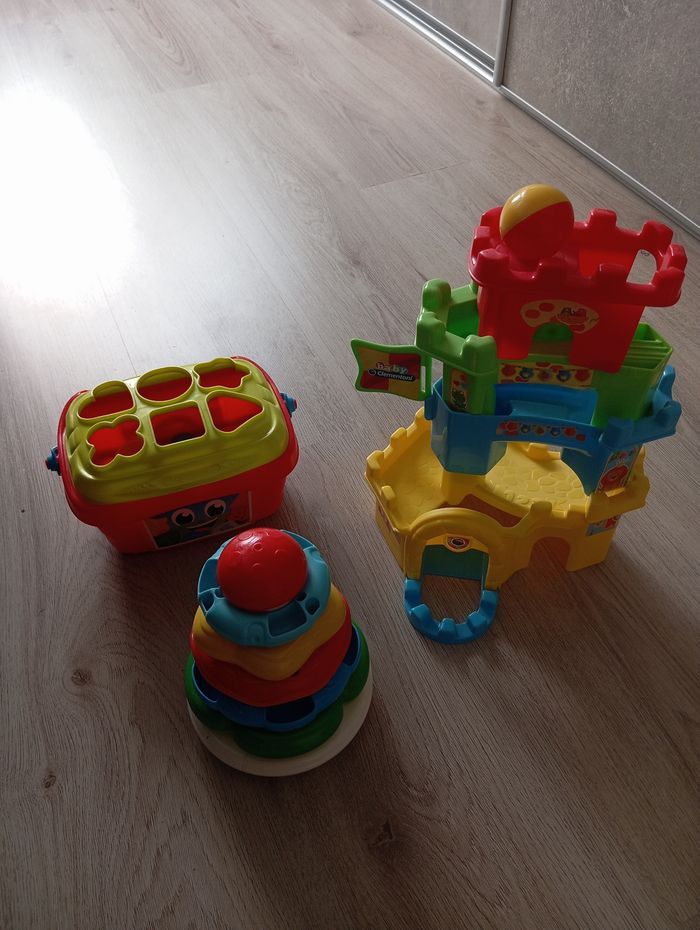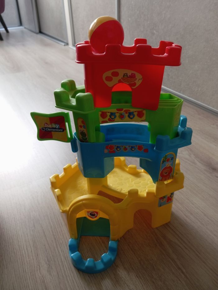 Château Roule-Boule, anneaux et trieur de forme. Le Château Roule-Boule de Clementoni est un jouet amusant pour les tout-petits. Il suffit de déposer la balle en haut du château et de la regarder dévaler les étages. La balle est suffisamment grosse pour que bébé l'attrape facilement. Ce jouet développe les capacités manuelles et la relation de cause à effet. Un panier trieur de formes avec 6 formes différentes à discerner et à insérer. Chaque forme est d'une couleur différente et présente un chiffre sur le dessus. La poignée pivotante permet de transporter facilement le panier mais aussi de verrouiller le couvercle. Stimule la coordination main-œil, la compréhension des relations de cause à effet et les habiletés manuelles. 5 anneaux colorés de différentes formes et tailles, à empiler sur une tour. Les anneaux sont conçus avec des reliefs différents qui stimulent la perception tactile des enfants durant leurs premiers mois. Stimule la motricité fine et la perception visuelle. Aide l'enfant à reconnaître les couleurs, les formes et à percevoir les tailles.