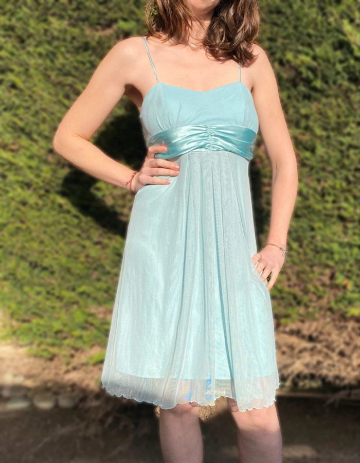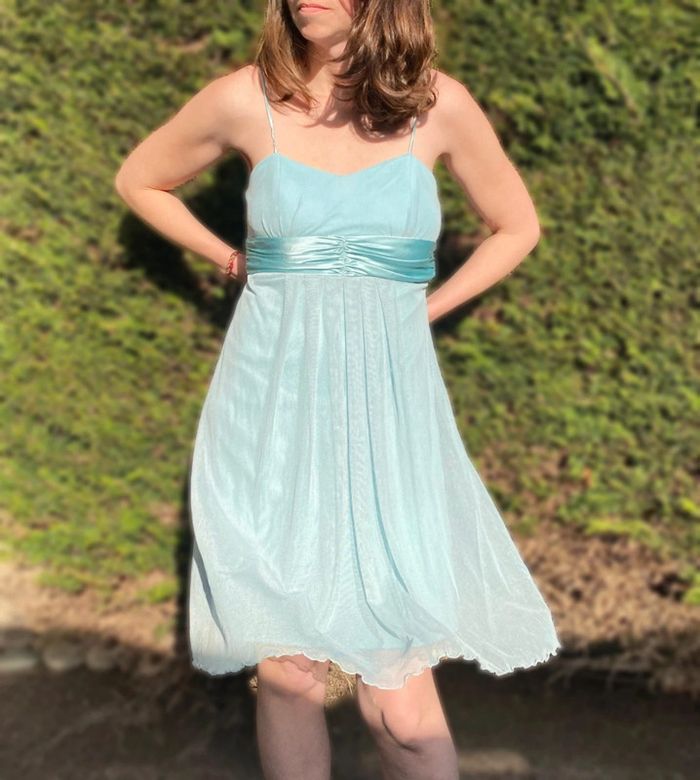 Jolie Robe de ceremonie bleu turquoise avec ceinture ruban C'est un 36/38 une bretelle avec petit details , mais presque invisible une fois portée , voire photos #robe #dress #vestido #court #short #bleu #turquoise #ceremonie #boda #mariage #wedding #party #fete #summer #verano #sexy #elegant #bapteme #teen #cocktail #demoiselledhonneur #azul #blue #cute #ninaferre #dafnezado #dafnezfemme #dafnez36 #dafnez38