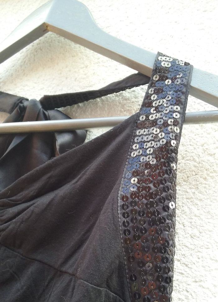 L'attache est en sequins et se termine par un ruban satiné, le t-shirt comprend des fronces sur les côtés de même qu'une petite sur le devant.