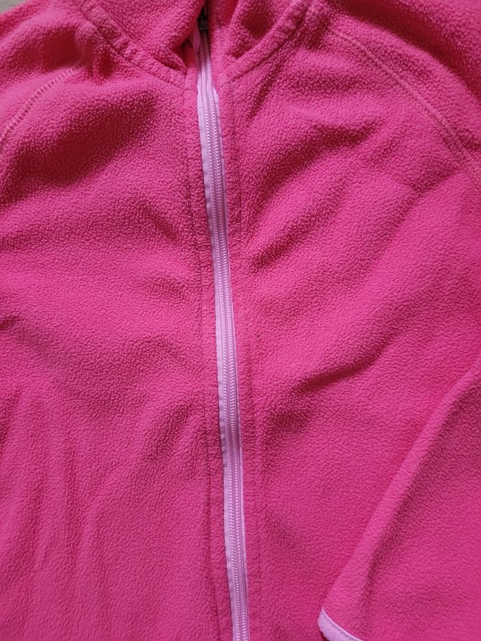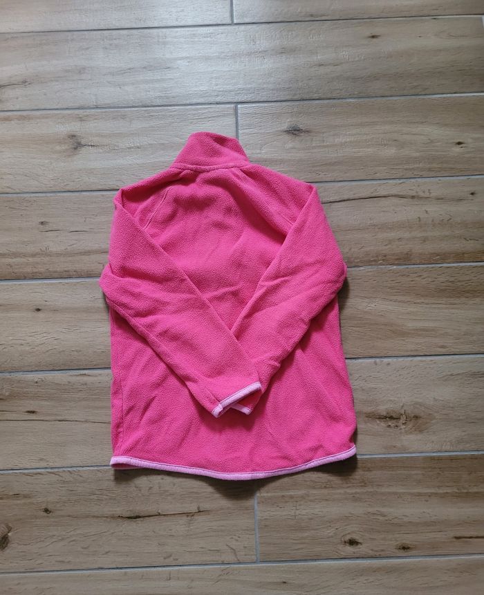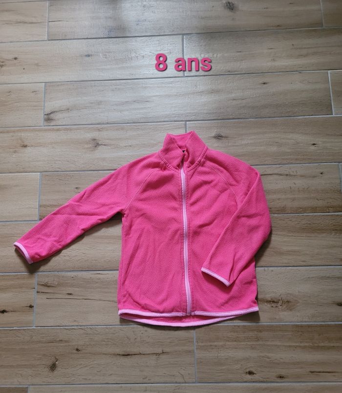 Gilet polaire rose, fermeture zippée sur le devant, col montant.