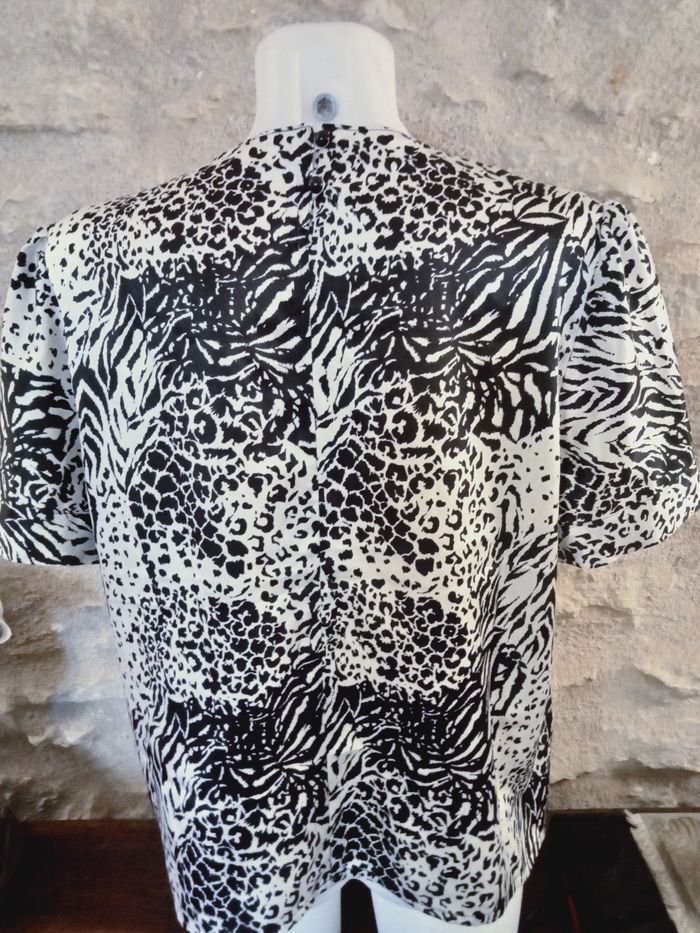 blouse manches courtes en matière synthétique très proche de la soie. en parfait état. aisselles à aisselles 55 cm épaules 40 cm Hauteur 60 cm.