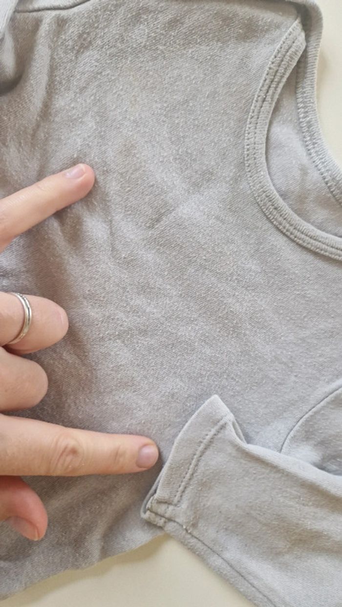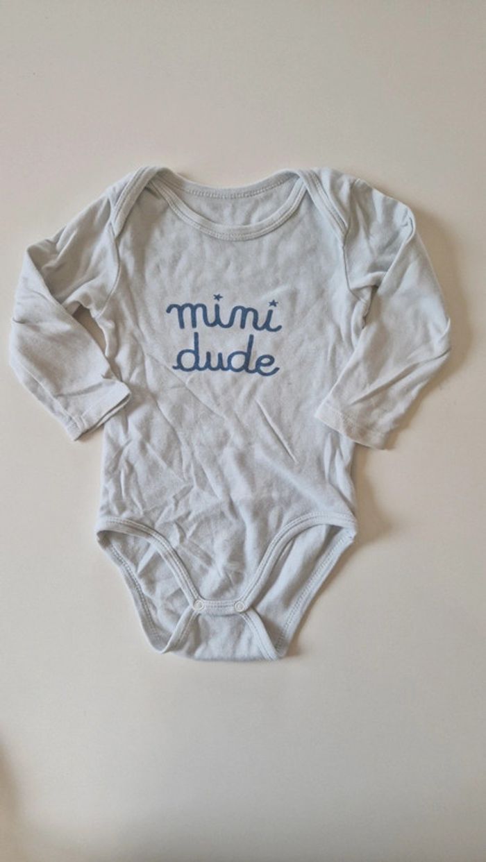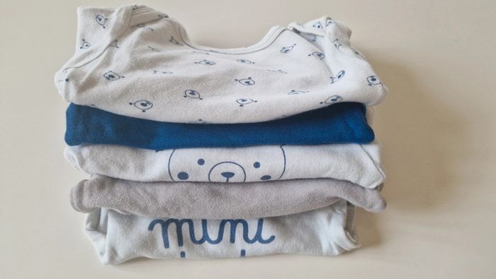 Lot de 5 bodies 12 mois kiabi État satisfaisant car porté. Le mini dude est grisonnant et le beige a des taches voir photos. Ces 2 la sont plutôt donnés avec le lot de 3.