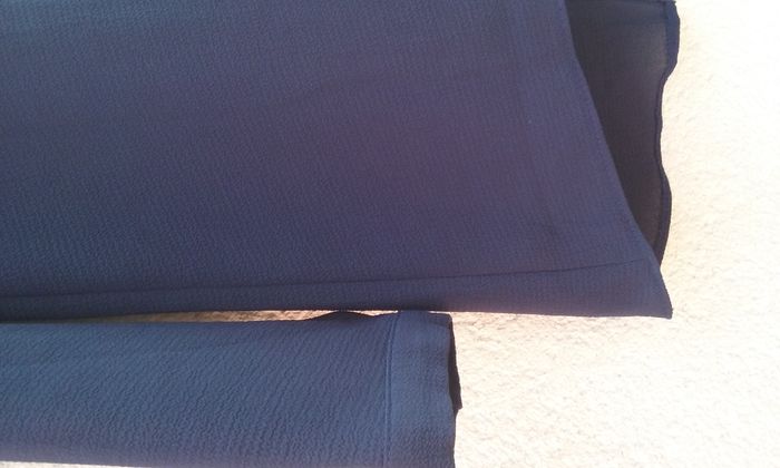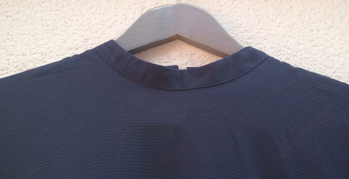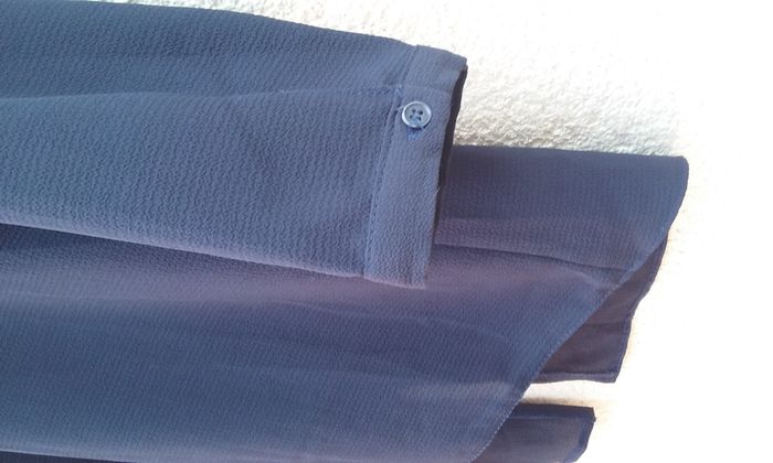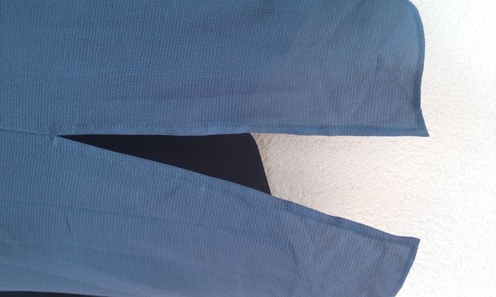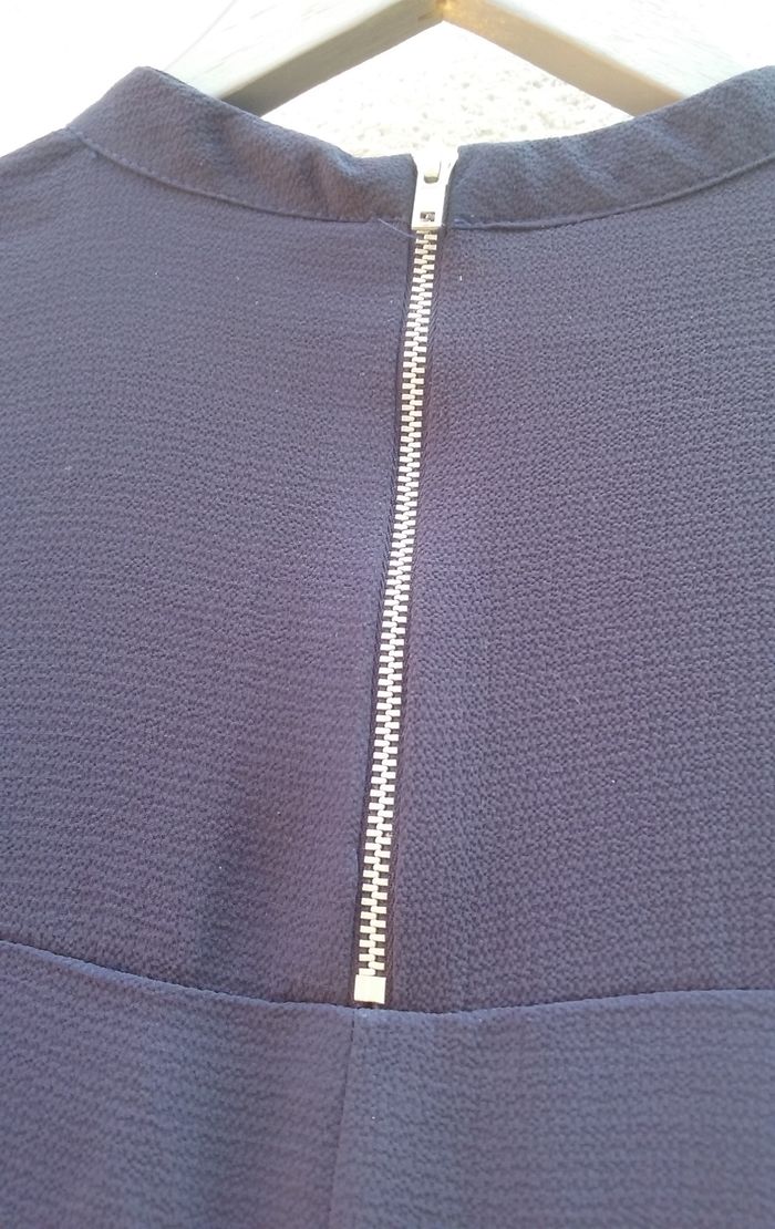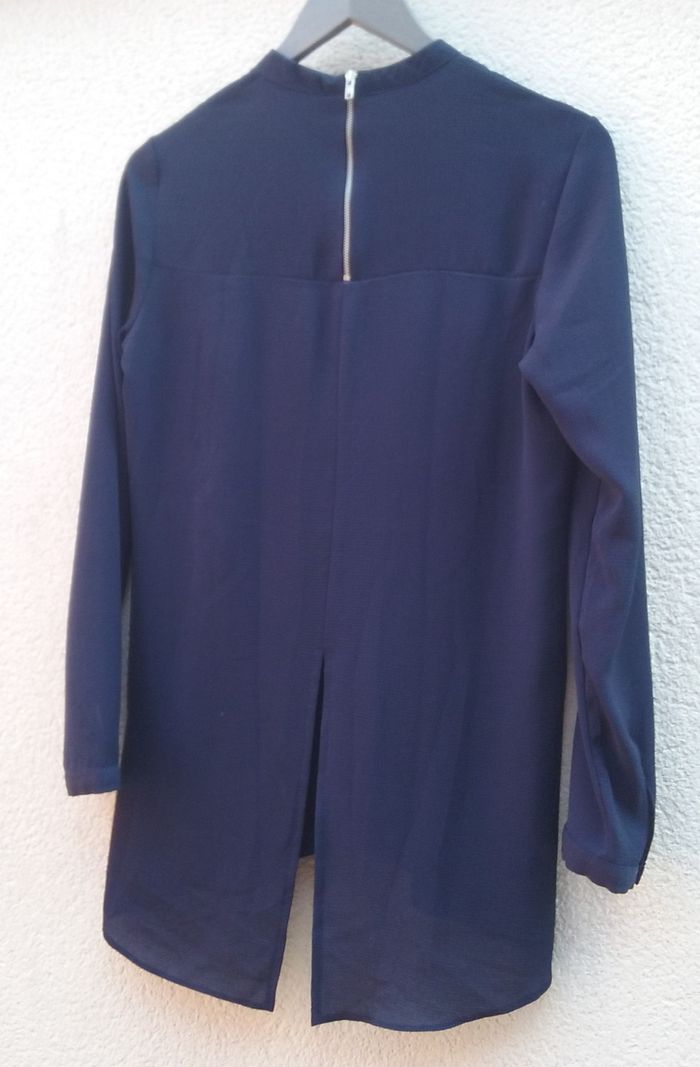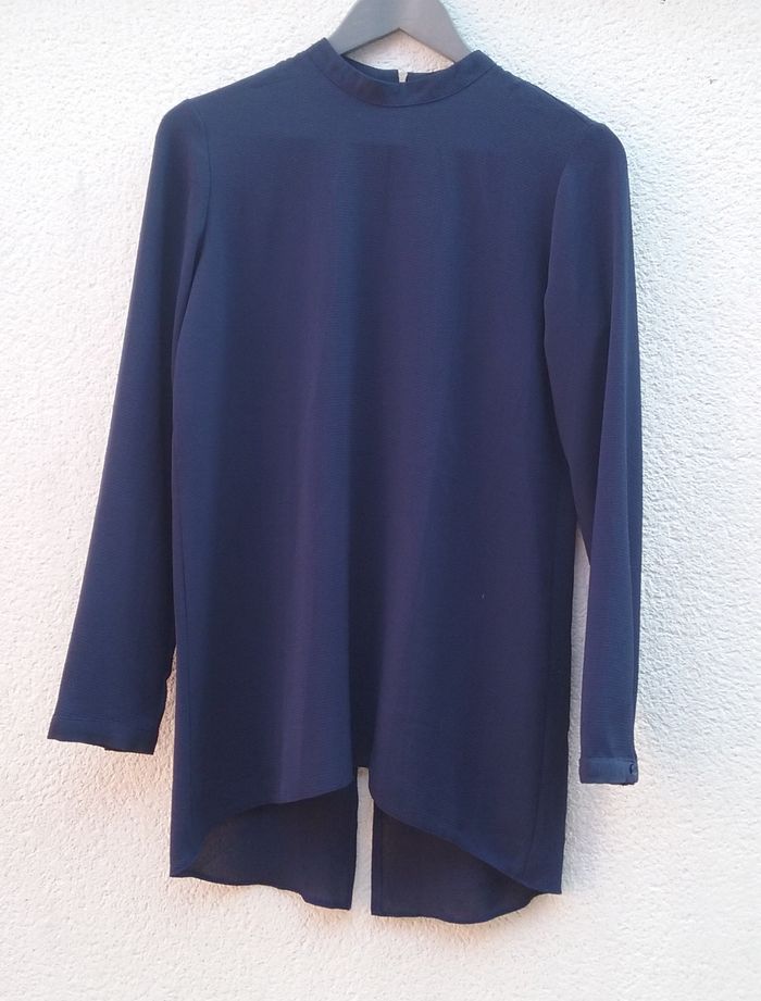 Le devant de cette tunique est plus court que le dos qui comprend un zip et une grande fente, le tissu est légèrement transparent.