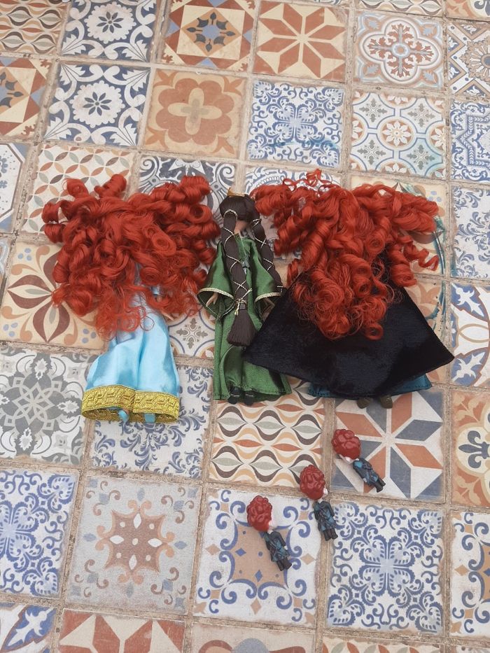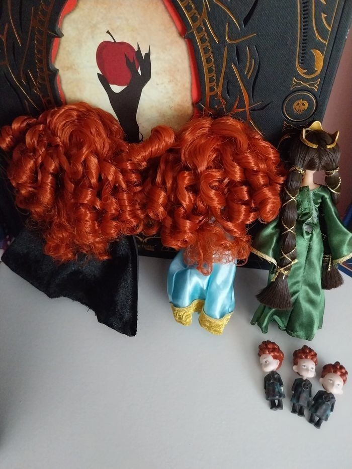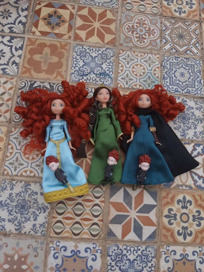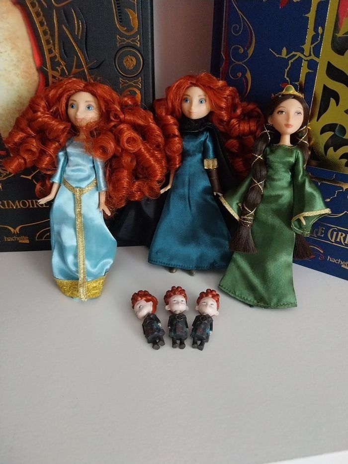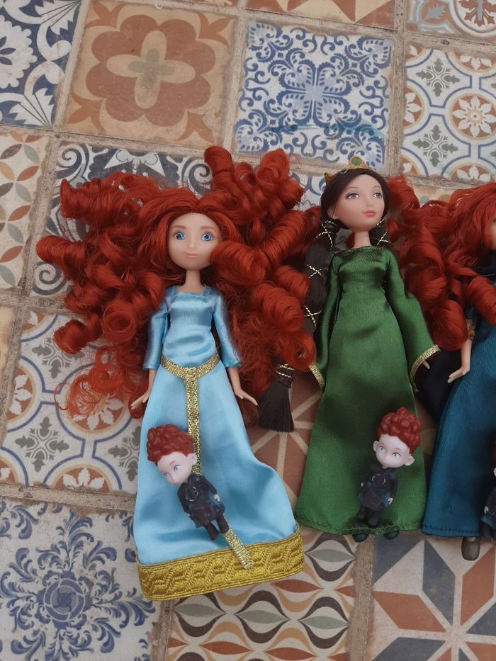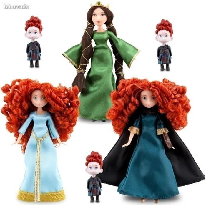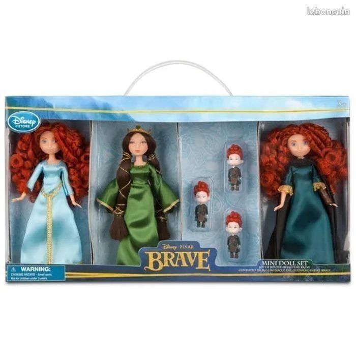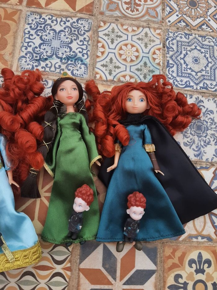 Non négociable. Les poupées n'ont pas de boîte. Merci de lire attentivement l'annonce, je ne suis pas responsable d'une mauvaise compréhension de celle-ci 😊 Je vends un set extrêmement rare de mini-poupées sorti en 2012 pour le dessin animé Rebelle Mérida Pixar. Il y deux poupées Mérida, une poupée Mérida avec sa tenue classique bleue noire robe d'aventurière et une autre poupée Mérida avec sa robe bleue de couronnement. Avec ceci, une magnifique poupée de la maman de Mérida, poupée Reine Elinor. Il y a également les mini-poupées des 3 frères de Mérida Hubert, Harris et Hamish. Mérida et sa maman font environ 13 centimètres et les triplés 4 centimètres. Les poupées sont en excellent état, quasi neuves, comme en photos. Sur les dernières photos, je vous montre ce qu'elles donnent dans la boîte parce que beaucoup ne connaissent pas ce set de poupées Mérida et au moins vous saurez d'où viennent ces poupées. PAS DE BOÎTE. 85€ Bring the Highland adventure to life with this Brave Mini Doll Set featuring two Merida dolls. Merida is joined by her mother, Queen Elinor, and triplet brothers. Set includes Merida in green Adventure dress, Merida in teal Formal dress, Queen Elinor, and Merida's triplet brothers Harris, Hubert, and Hamish Queen Elinor's dress features gold detailing and crown Merida and Queen Elinor dolls: 5'' H Triplet figures: 1 1/2'' H (tailles en pouce)