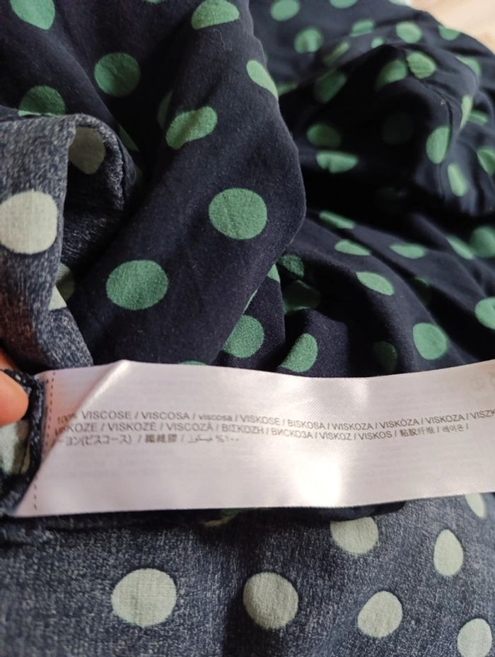 Magnifique blouse et d'une belle qualité 100% viscose fluide et très agréable à porter Encore plus belle en vraie que sur les photos C'est un bleu foncée avec des points verts Elle n'a jamais été portée (trop de vêtements et ensuite changement de taille...) Largeur 59cm Longueur 64cm Marque mango achetée sur Zalando 35 euros Envoi rapide mondial Relay ou Chronopost 🙂