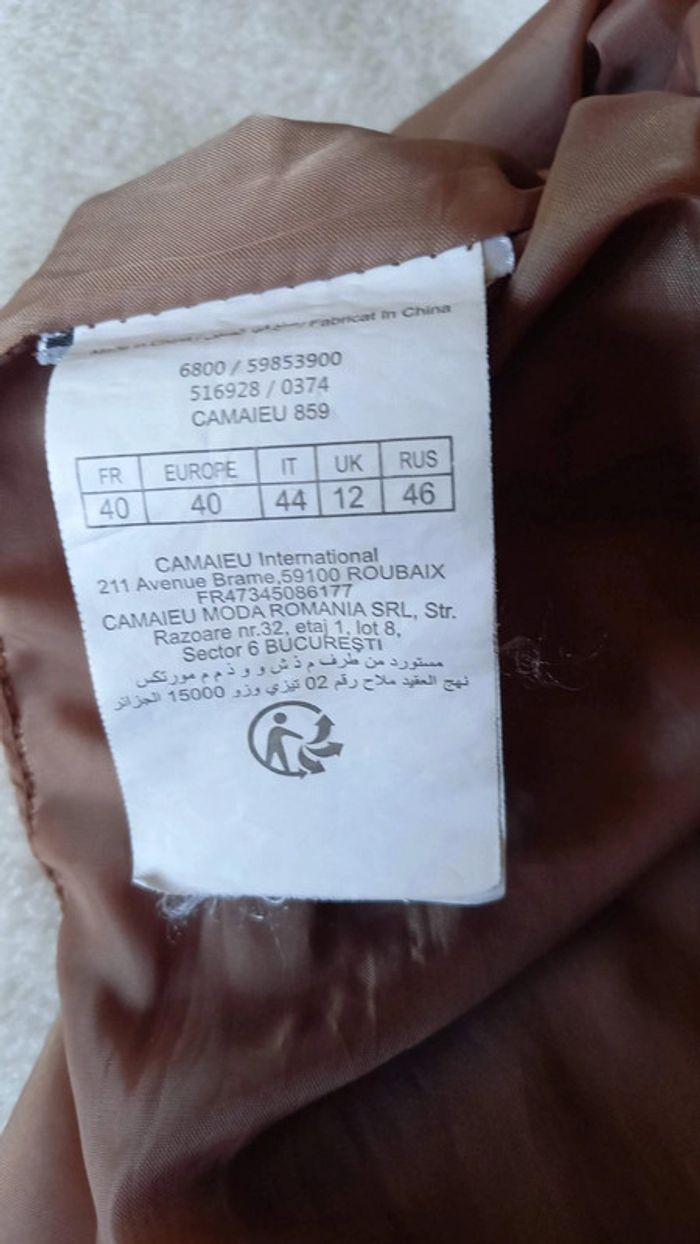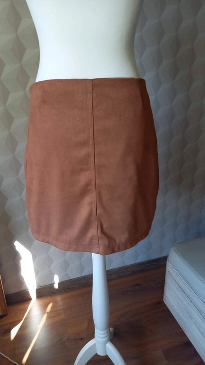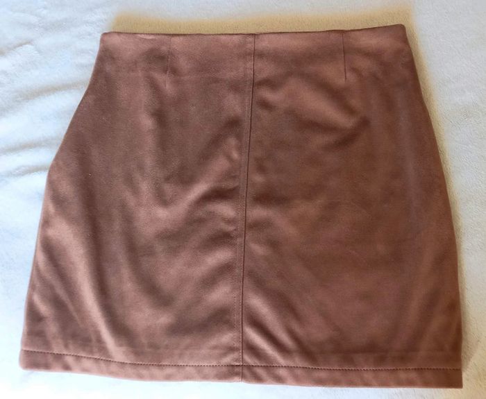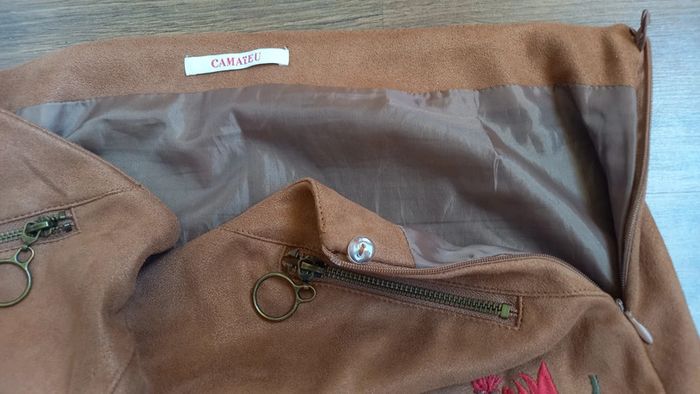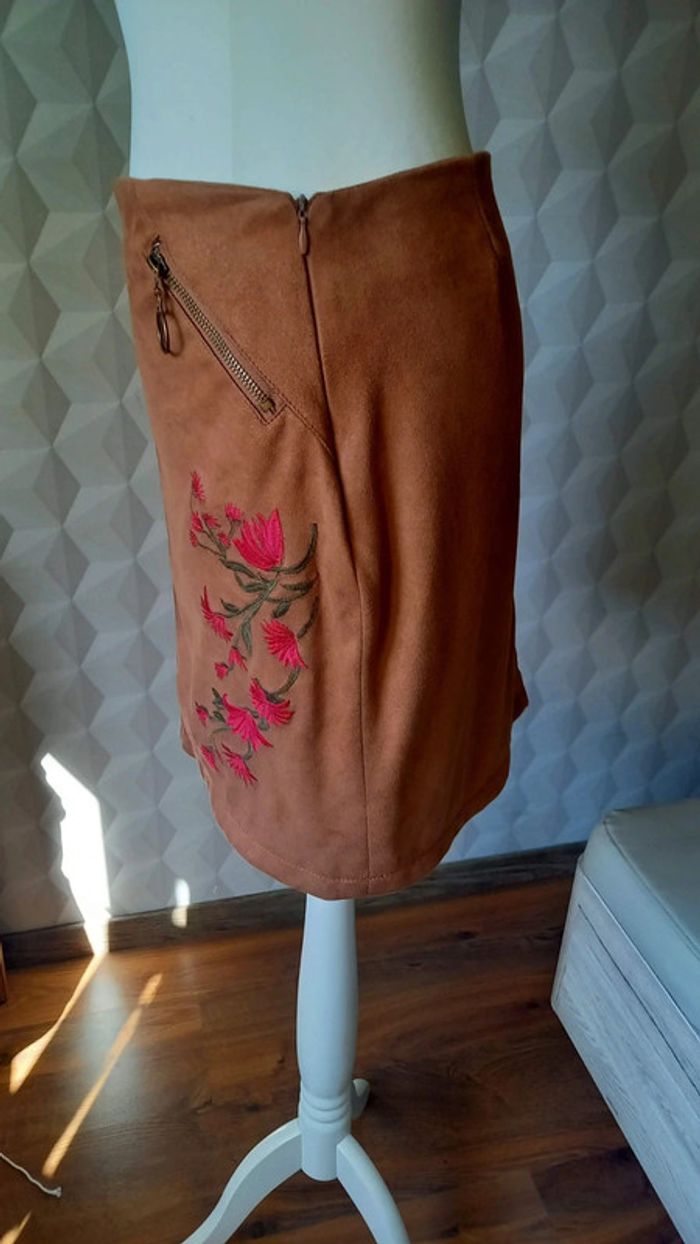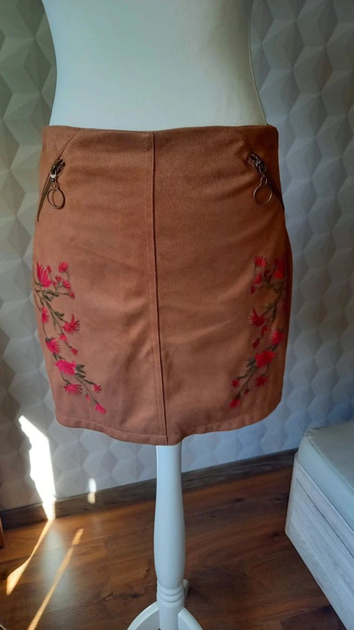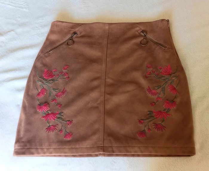 Jupe doublée avec broderies Deux fausses poches, fine fermeture éclair côté gauche, touché peau de pêche. Longueur 42 cm 100% polyester Marque Camaïeu Taille 40 Très bon état #linejac40