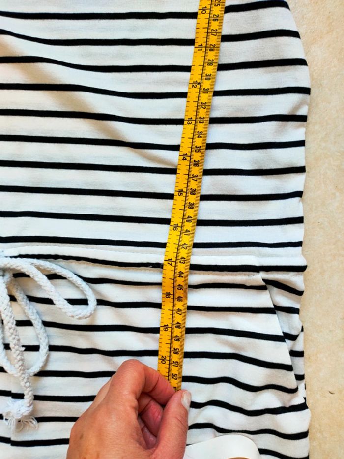 Col rond Sans manches Coloris blanc rayée bleu 2 poches latérales Cordon de resserrage Taille grand #didinedorataille36 #marinière #rayures #combishort #combinaison #été