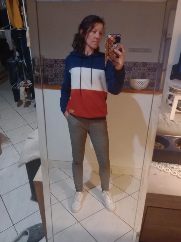 Confortable, ce pantalon dispose d'une élastique au niveau de la taille, d'une fausse bringuette et de deux poches sur les côtés Trop serré pour moi je porte un petit M habituellement... là c'est du xs 😅 Plus d'étiquette matière Longueur 101 cm Largeur à plat entre 34 et 35 cm #carineleray_femme_34