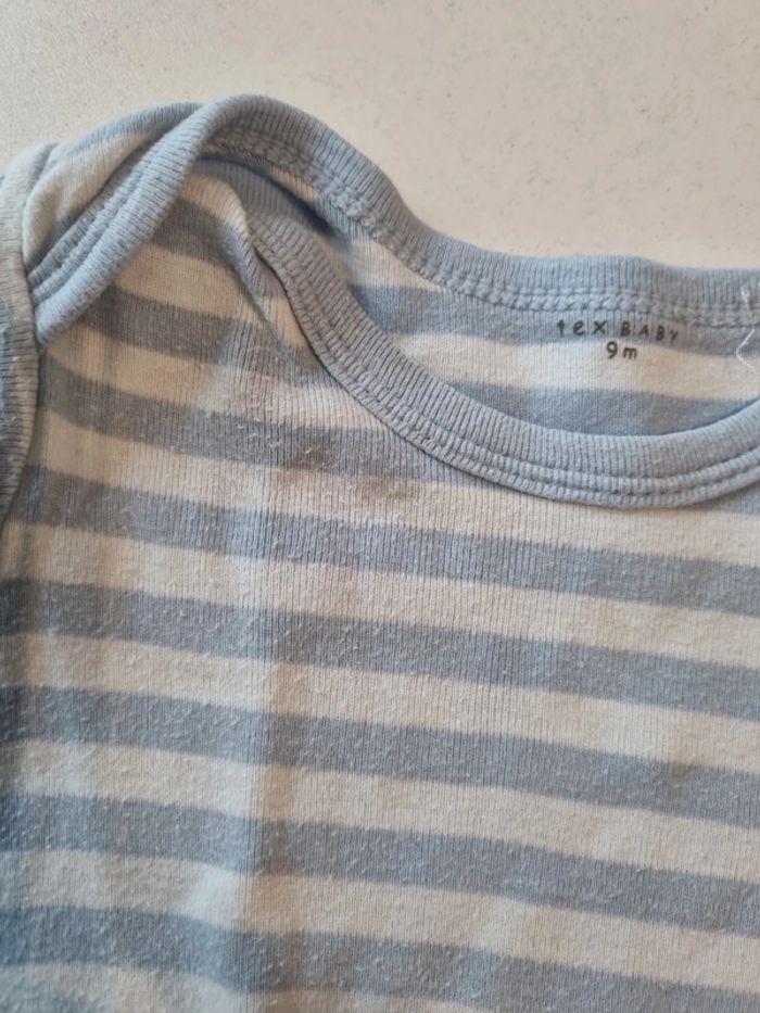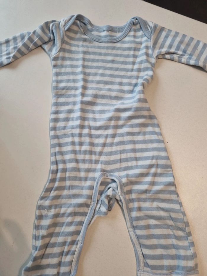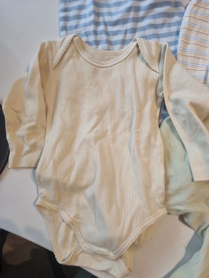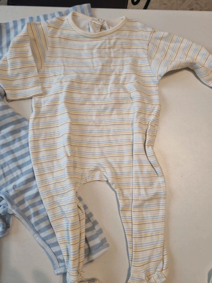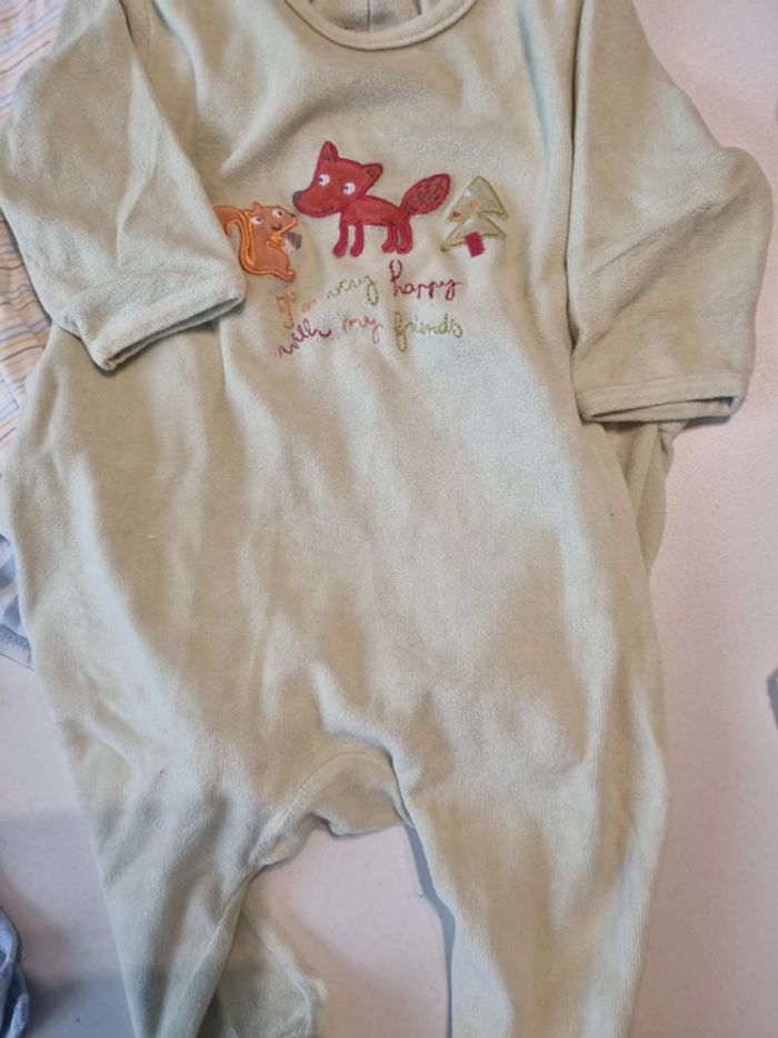 Lot 9 mois avec 1 Pyjama velours vert kiabi, 9 mois, petites traces au col, 2 pyjamas coton dont 1 avec tâche devant, 1 body manches longues avec légères traces #somara66garcon9mois