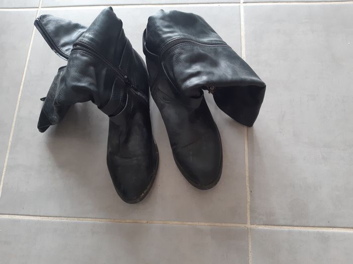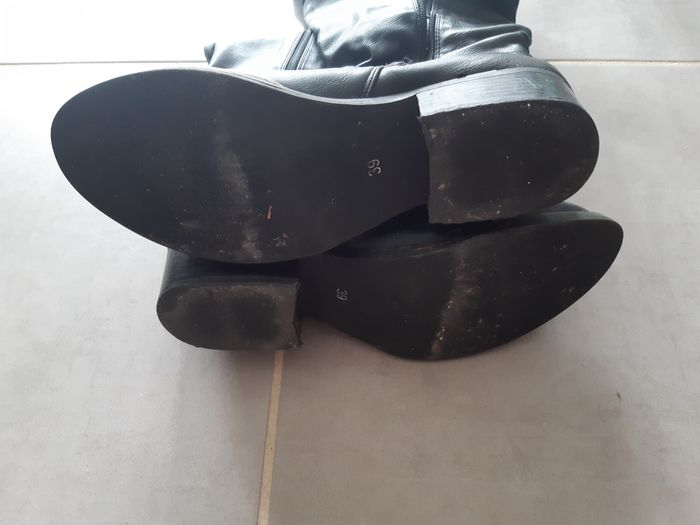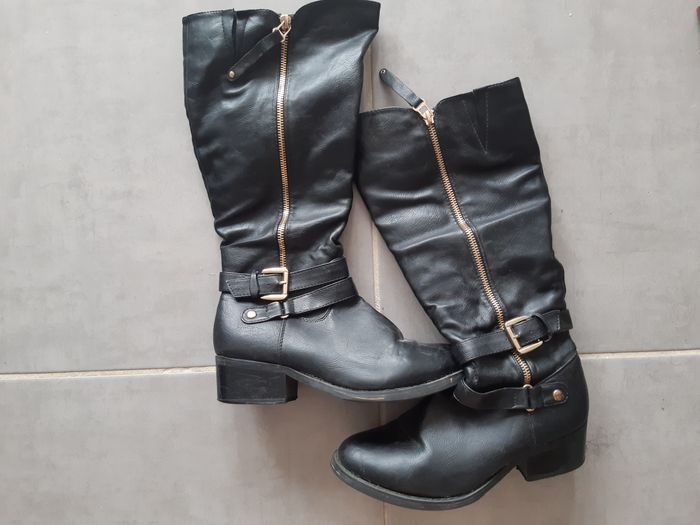 Bottes hautes noires à fermeture éclair sur toute la hauteur et boucle de serrage au niveau du pied Hauteur des bottes env. 41 cm avec talon de 4 cm Pointure 39