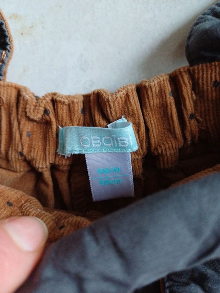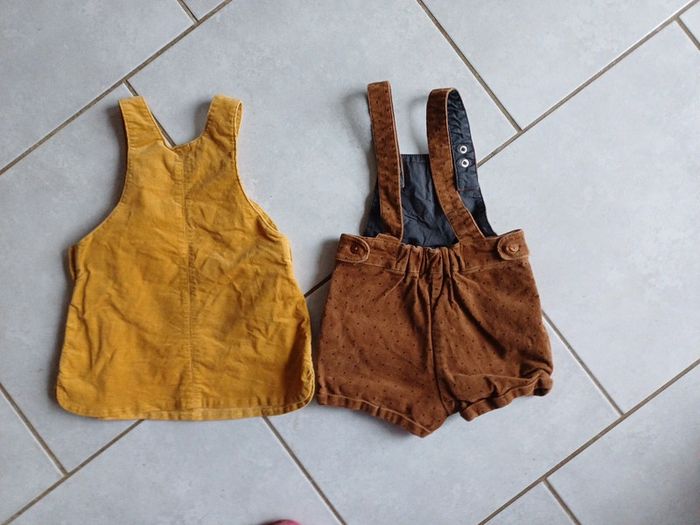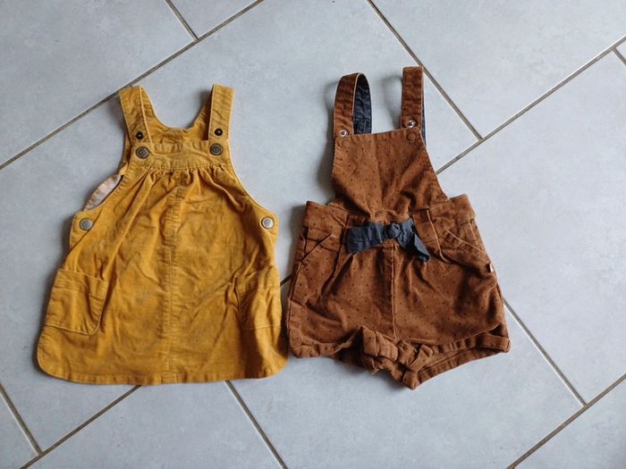 Lot de 2 salopettes velour 6 mois une salopette jupe tape à l'œil et 1 salopette short okaidi. En très bon état. 3.50 euros