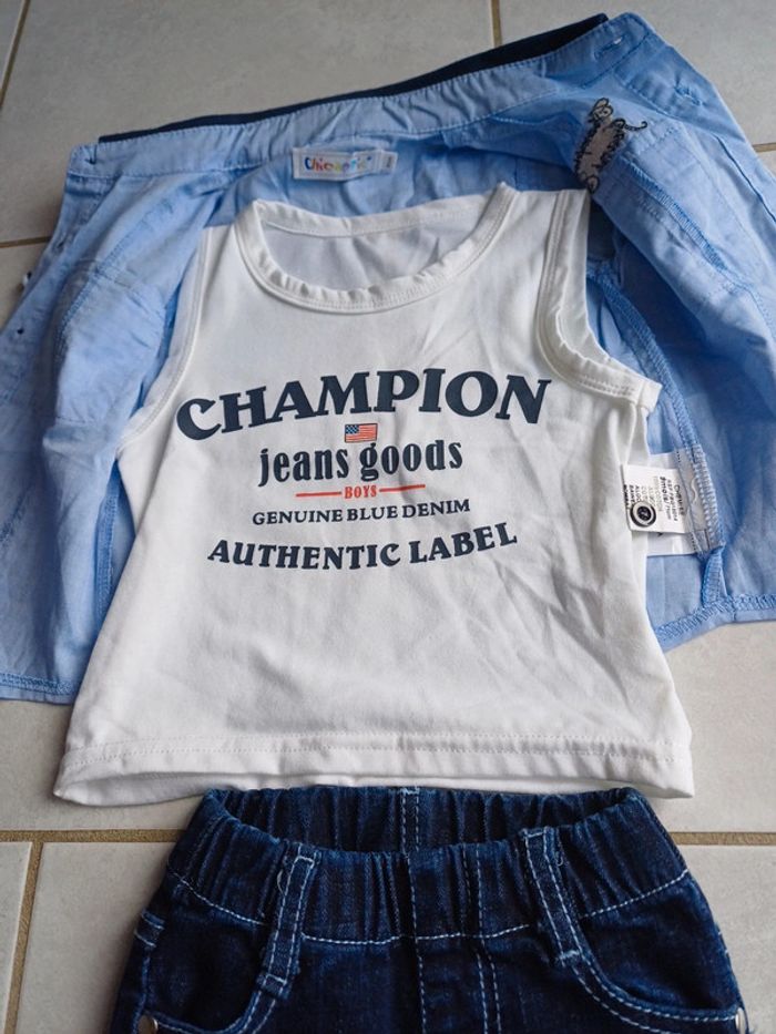 Ensemble 9 mois chemise, tee-shirt sans manches neu et jean porté.5 euros