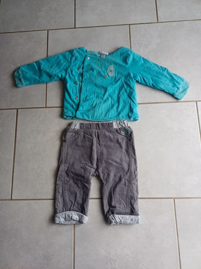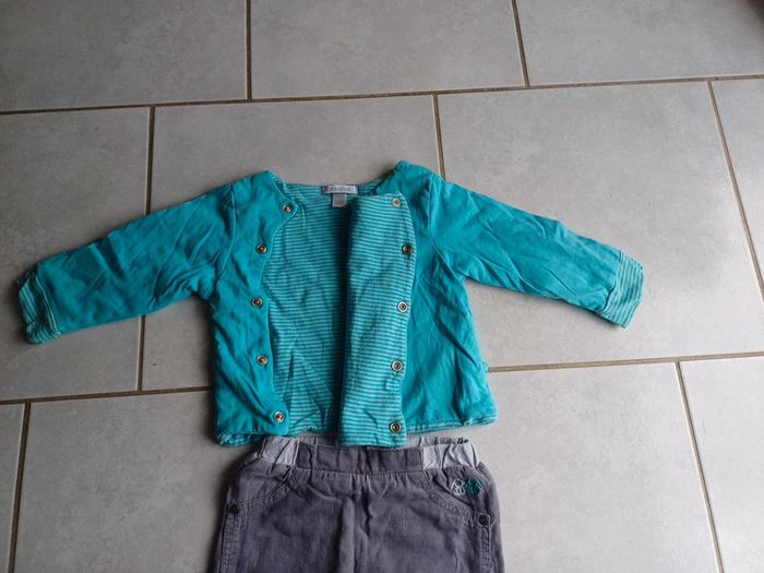Ensemble 6 mois obaïbi porté gilet chaud légèrement taché au col et un peu en bas avec pantalon gris en très bon état. 4 euros