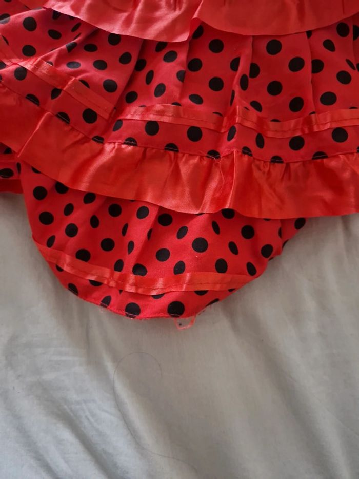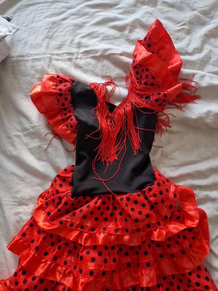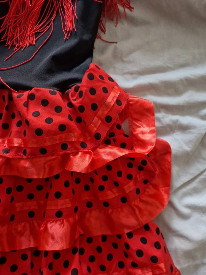 Robe de flamenco rouge et noir à petit pois. Bon état général, le ruban est décousue à certain endroit nécessitera de la couture. Taille 6 ans