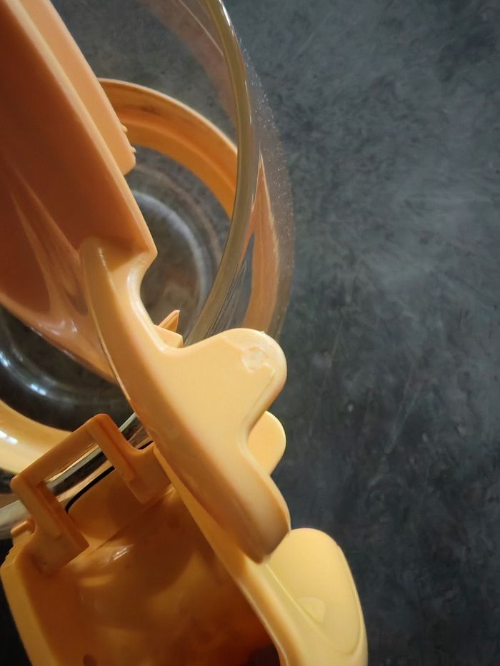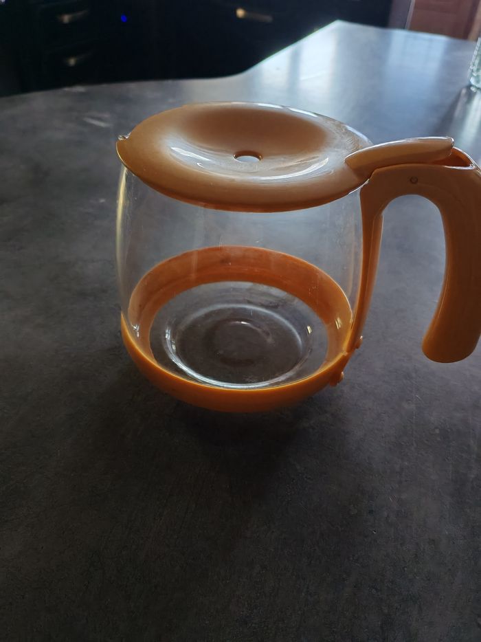 Verseuse cafetière. Une accroche plastique du couvercle en plastique cassé. Environ 13 cm de haut pour 12cm de diamètre.