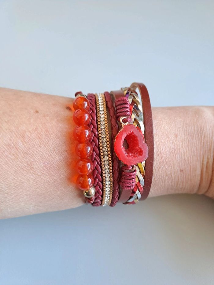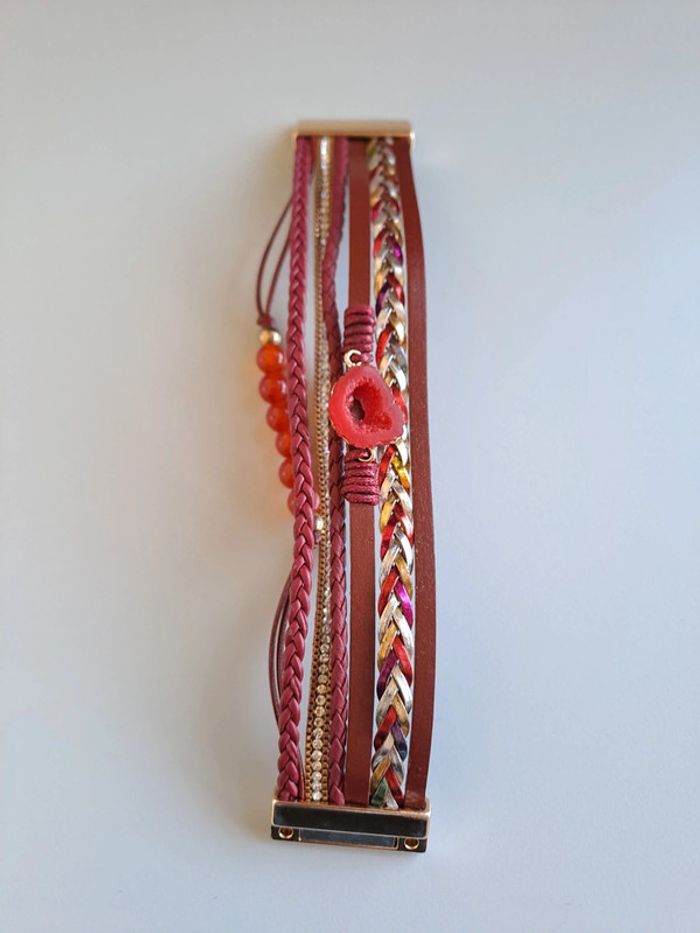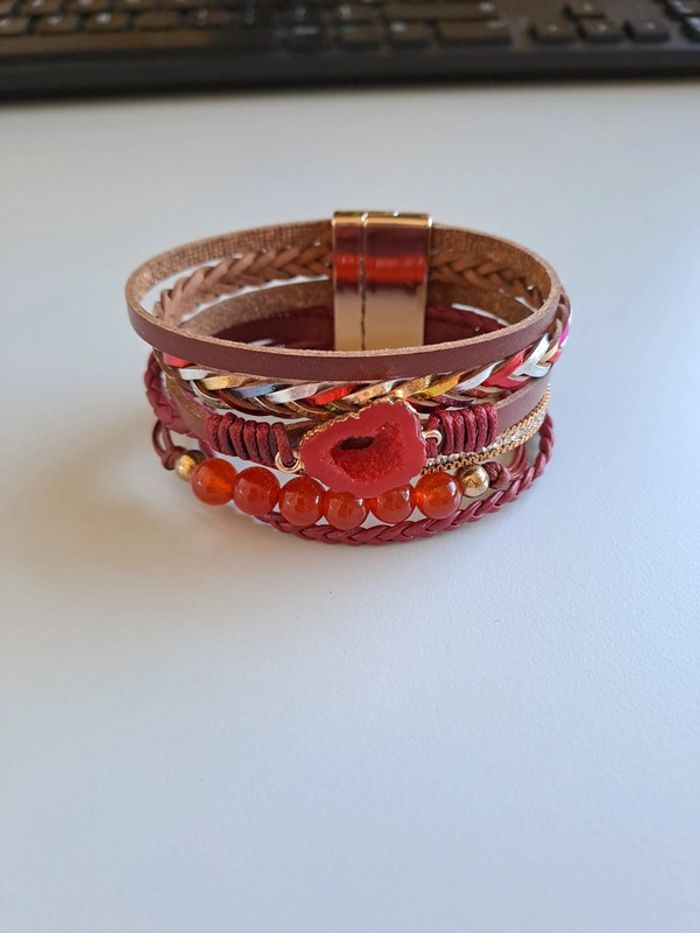 Bracelet multirangs cuir perles et pierre Coloris rouge, brun, bordeaux Fermoir magnétique Longueur 19 cm #braceletfemme #bracelet