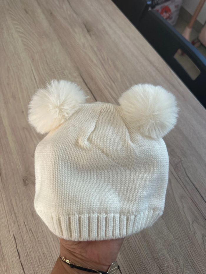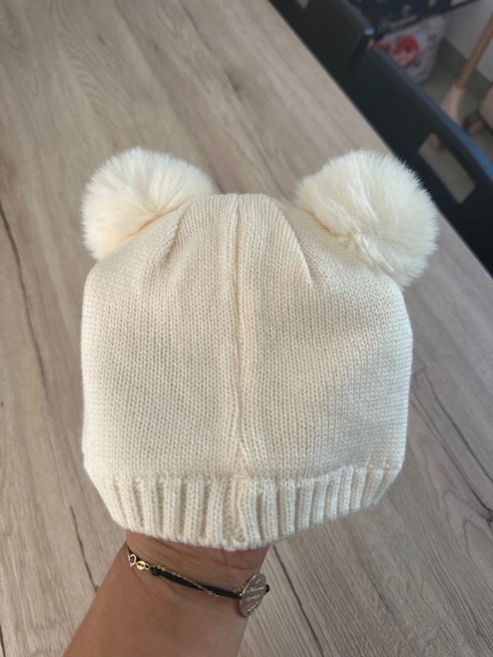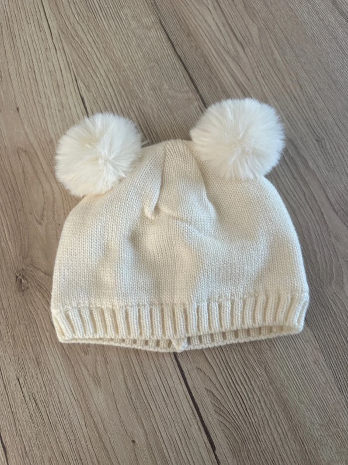 Bonnet couleur crème avec pompons Taille 44cm Noté 9/12 mois mais je l’ai mis à ma fille quand elle portait du 2 ans Très peu porté Très bon état #2ansroms1387