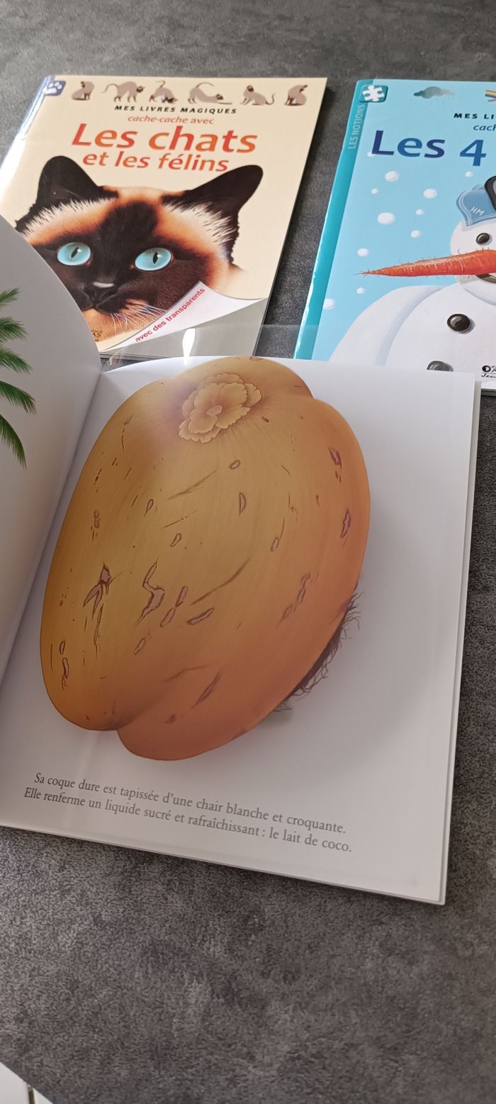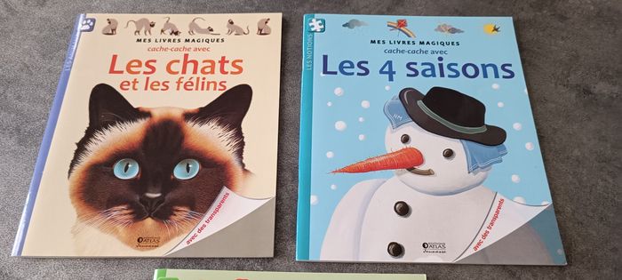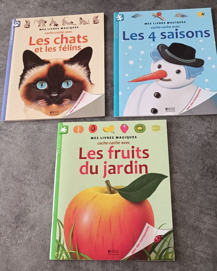 Lot de 3 livres magiques Atlas : Les chats et les félins, les quatre saisons et les fruits du jardin.