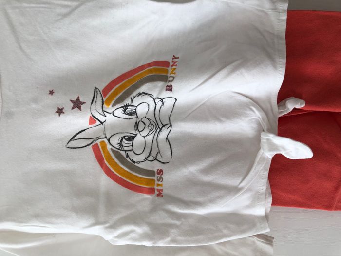 Ensemble fille deux pièces, composé d'un haut manches longues et d'un pantalon élastiqué à la taille. Motif Miss Bunny devant un arc-en-ciel Marque Disney (haut) et Kiabi (bas) Taille 24 mois