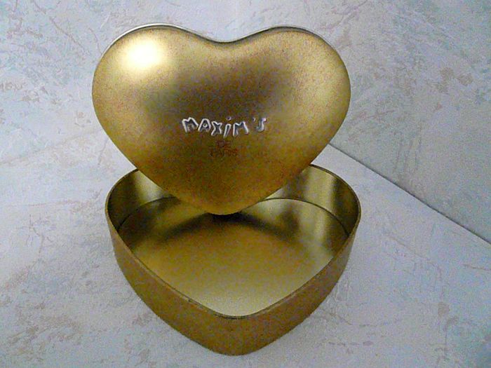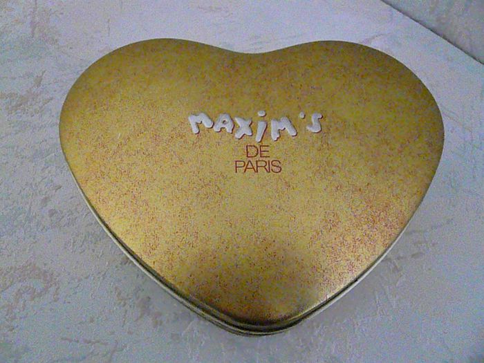 Boîte en métal en forme de cœur Maxim’s. Couleur doré. Dimensions : 16 cm x 14 cm x h 5 cm. Etat neuf.