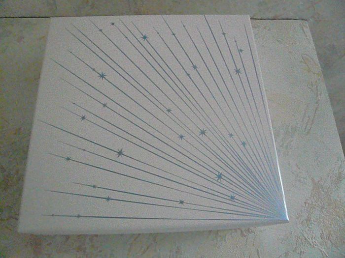 Boîte cadeau blanche à motif bleu irisé. Réutilisable, avec couvercle. Peut servir de boîte de rangement. Format boîte : 19,5 x 19,5 x 7 cm. J’en ai une deuxième identique. Etat neuf. 8 € la boîte.