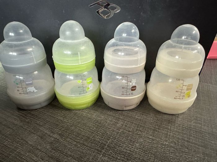 4 biberon MAM ANTI COLIQUE casi neuf en 130ml sans tétine dont 1 neuf en 130ml avec tétine débit 1 .