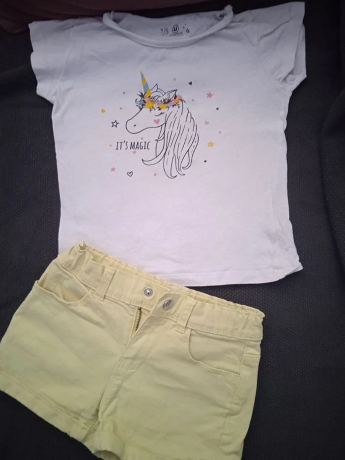 Short Kiabi 6 ans réglable à la taille très bon état+ tee-shirt licorne super u