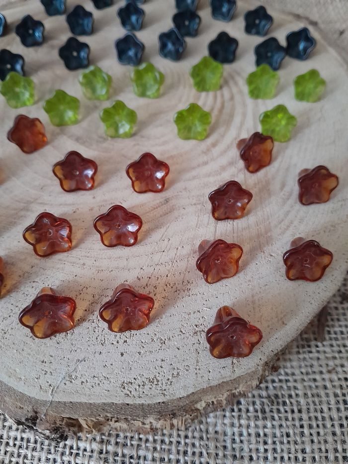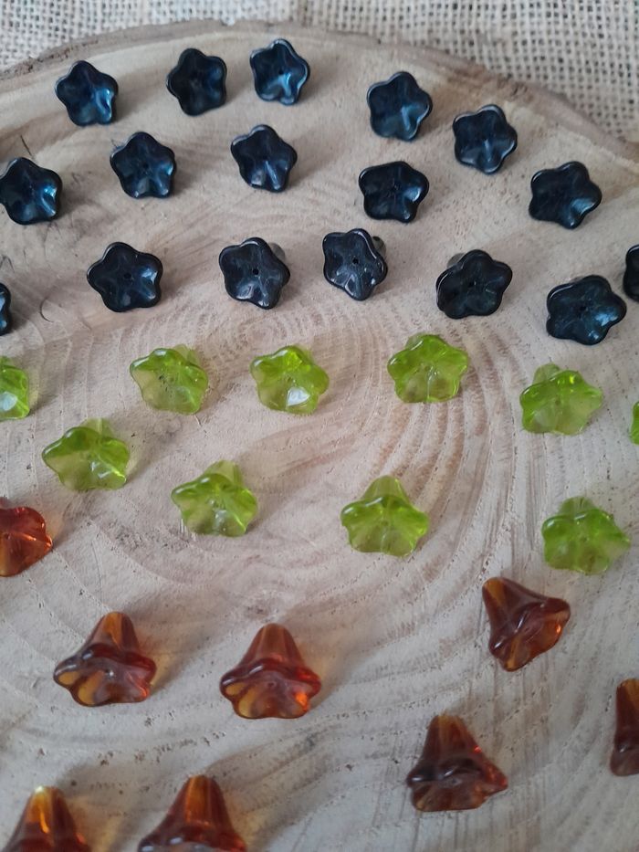 Lot de 50 perles en verre fleurs noires marron et vertes.