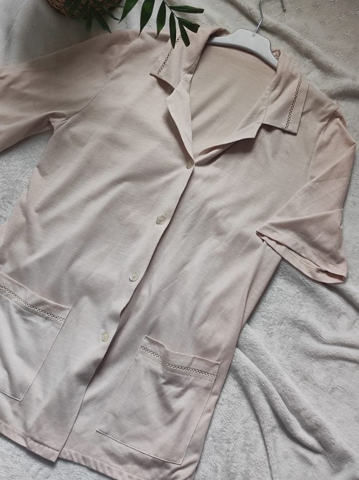haut / veste / chemisier vintage couleur beige clair / crème, léger et fluide à manches courtes. Col replié et fermeture à boutons. Avec poches larges , échancrée sur le côté. En bon état Dimensions Épaules 42 cm Aisselles 53 cm Hauteur 73 cm Tour de taille 54 cm